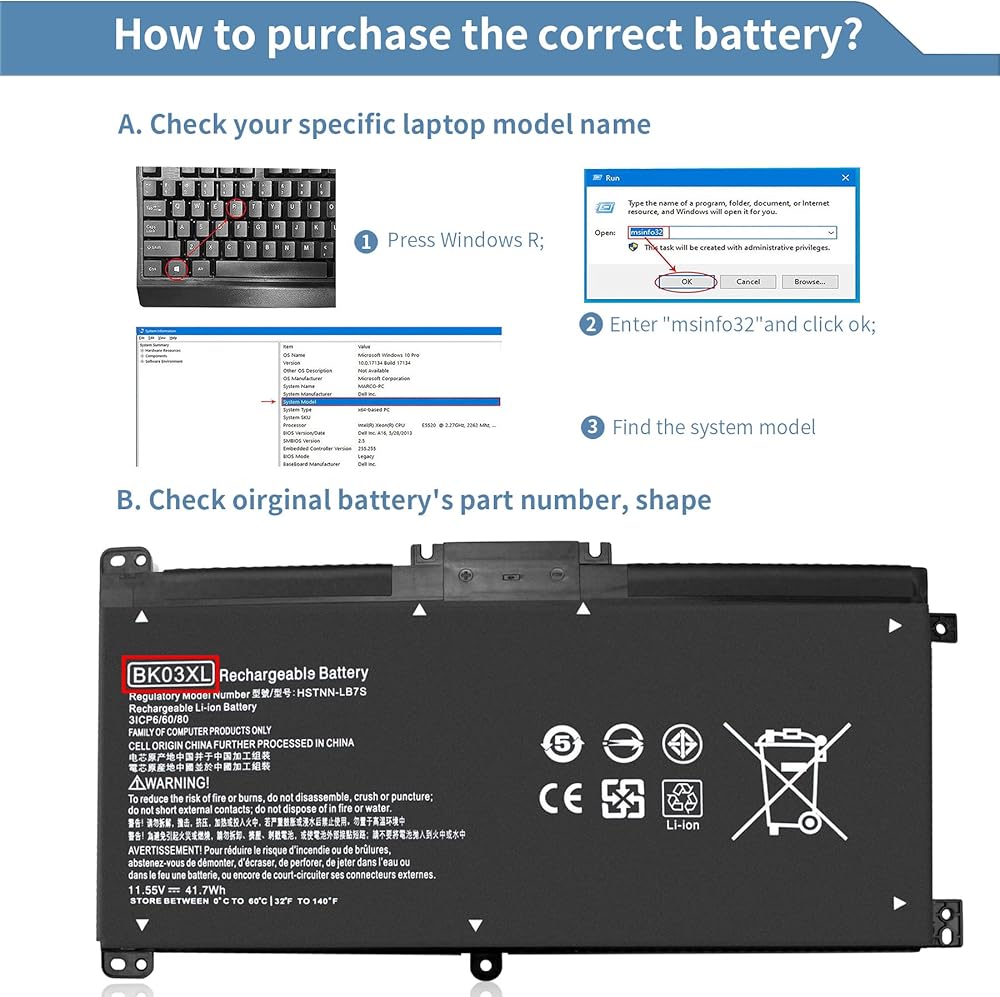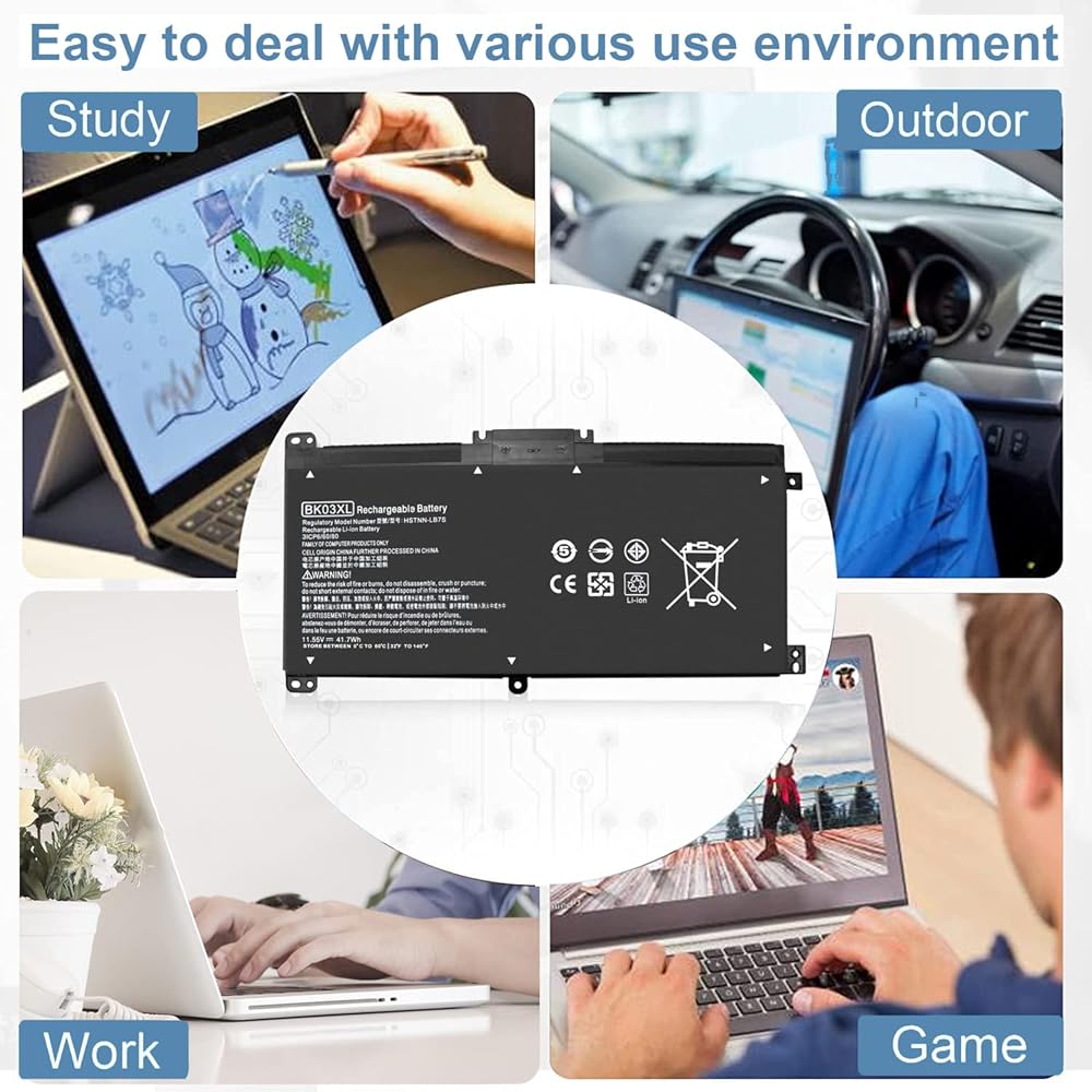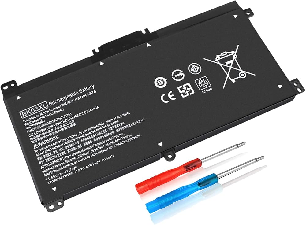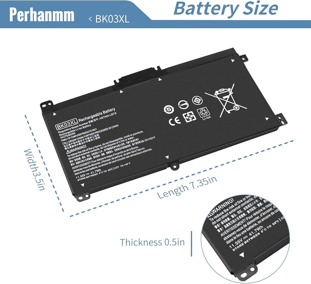 المواصفات: الطراز: بطارية قابلة للشحن BK03XL؛ نوع البطارية: ليثيوم بوليمر؛ الجهد االكهربى: 11.55 فولت؛ السعة: 41.7 وات في الساعة؛ الخلايا: 3 خلايا؛ حالة: جديدة؛ تتضمن الحزم: 1 قطعة بطارية كمبيوتر محمول (مع مفكين لسهولة التركيب)