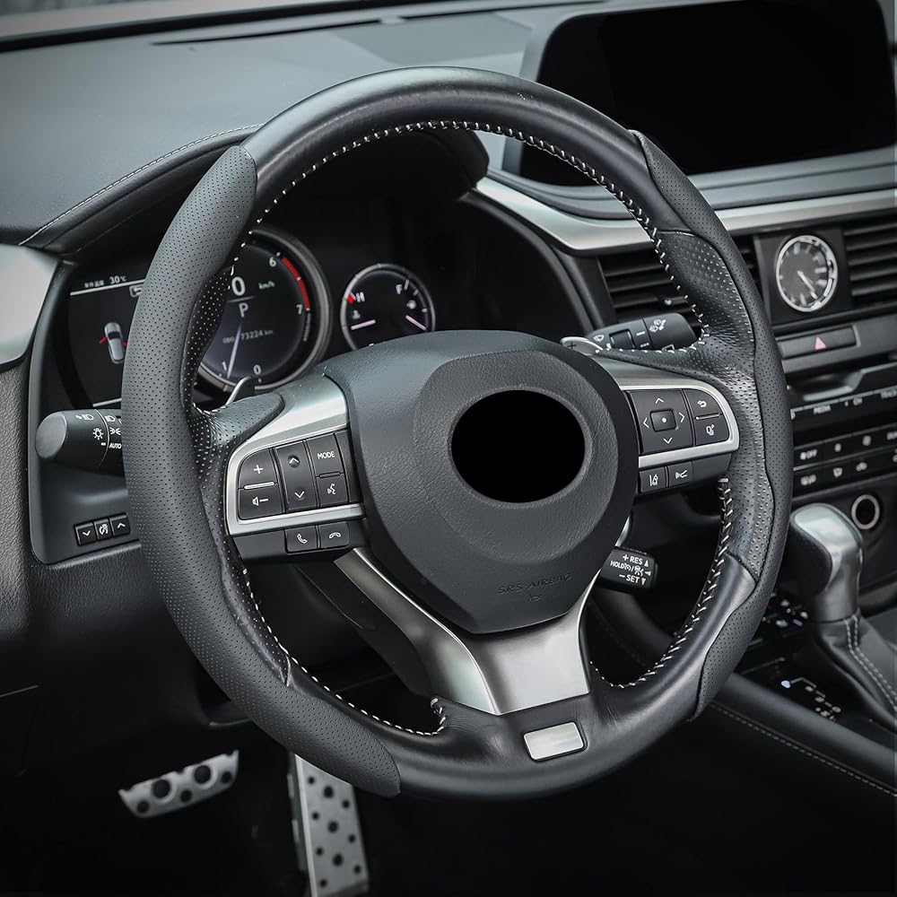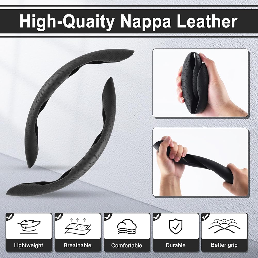 Comfortable Touch:Unique Nappa leather texture increases friction and effectively prevents slippage, providing you with excellent steering wheel grip and relieving fatigue after long hours of driving. The surface has dense breathable holes, no stuffy sweat in summer, universal for all seasons.