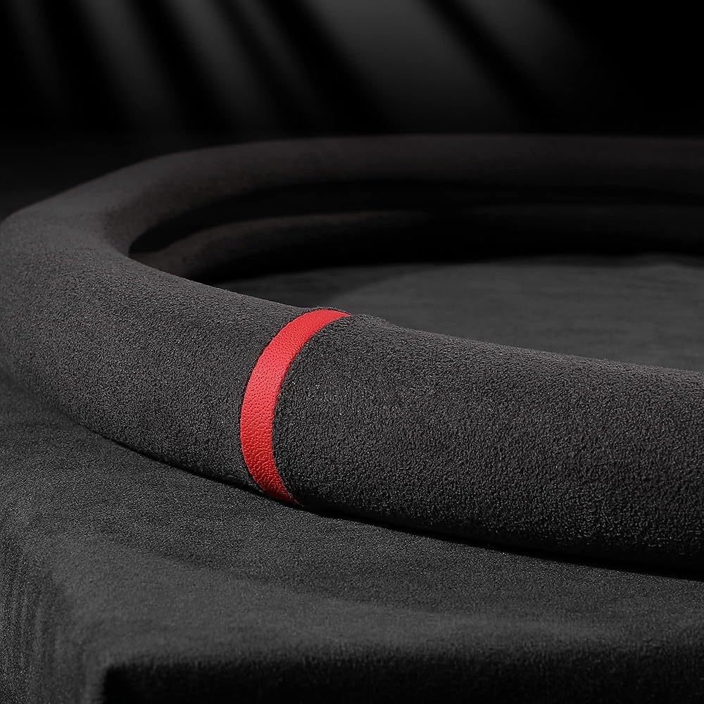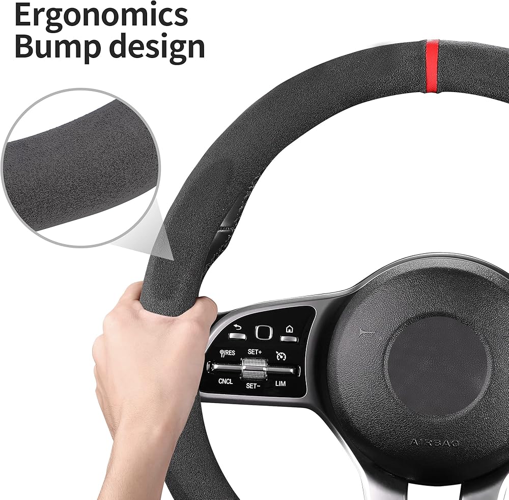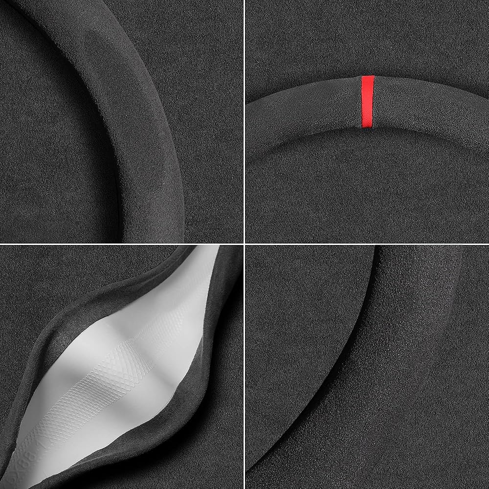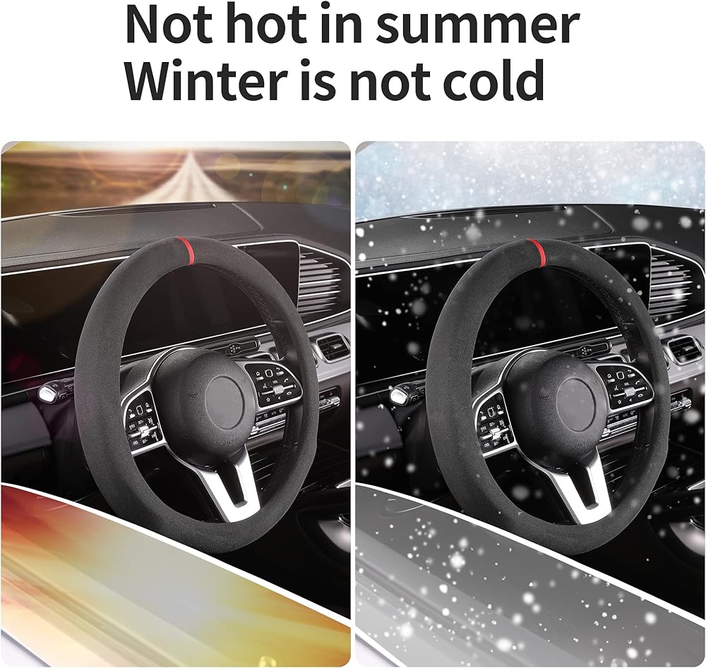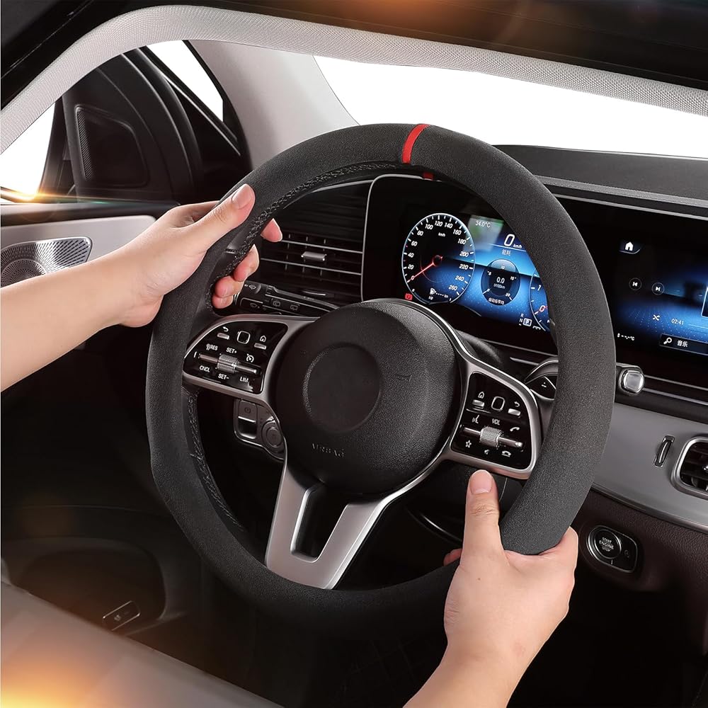 【مواد عالية الجودة】غطاء عجلة القيادة من جلد الكشمير المصنوع من ألياف الكربون عالي الجودة، أضف علامة إرجاع حمراء تجعلك مليئة بالشغف.