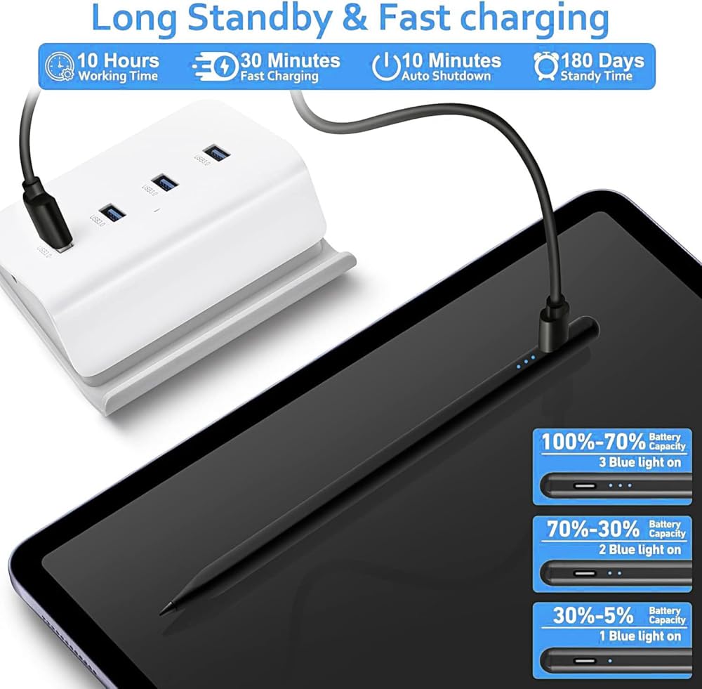 【Faster Charge & LED Power Indicator】 with USB-C charging port and 130mah built-in battery, it only takes 30 minutes to fully charge and work for 10 hours continuously. Automatically turn off after being idle for 10 minutes. 3 indicators design can clearly see power of the stylus pen, timely charge, and avoid automatic shutdown due to lack of power during use. No bluetooth needed.