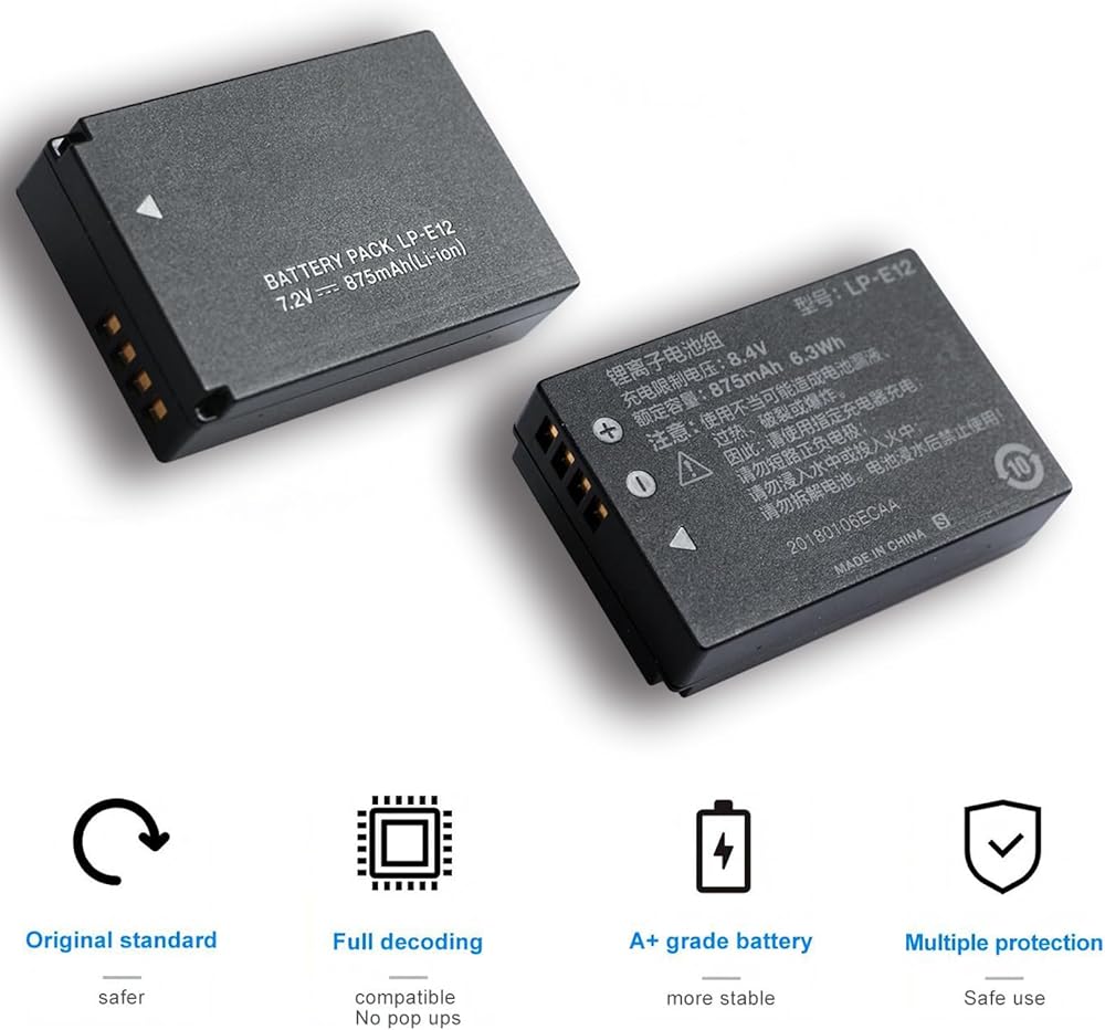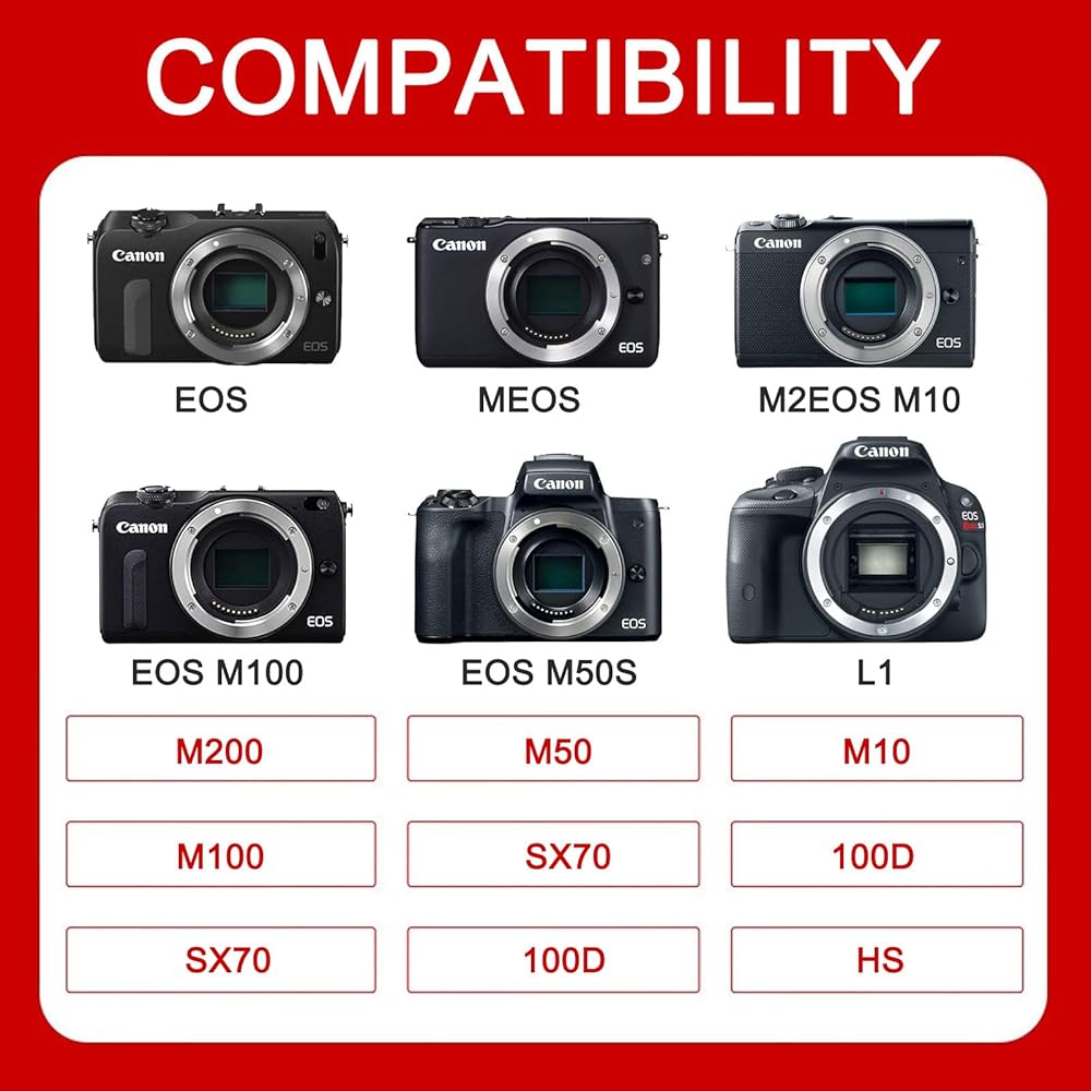 Compatible with Canon LC-E12 battery charger and Charges in 3-6 Hours , And can Charge From Empty Or half Full Power With no Memory Effect , and made for Canon EOS M, EOS M10, EOS M100, EOS M200, EOS M50, EOS M50 Mark II, EOS Rebel SL1, Canon LC-E12, PowerShot SX70 HS, Vello BG-C11, Watson DUO, Watson Mini Duo