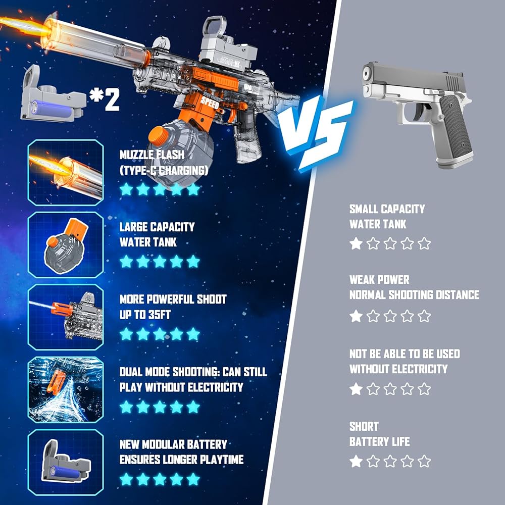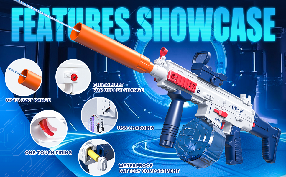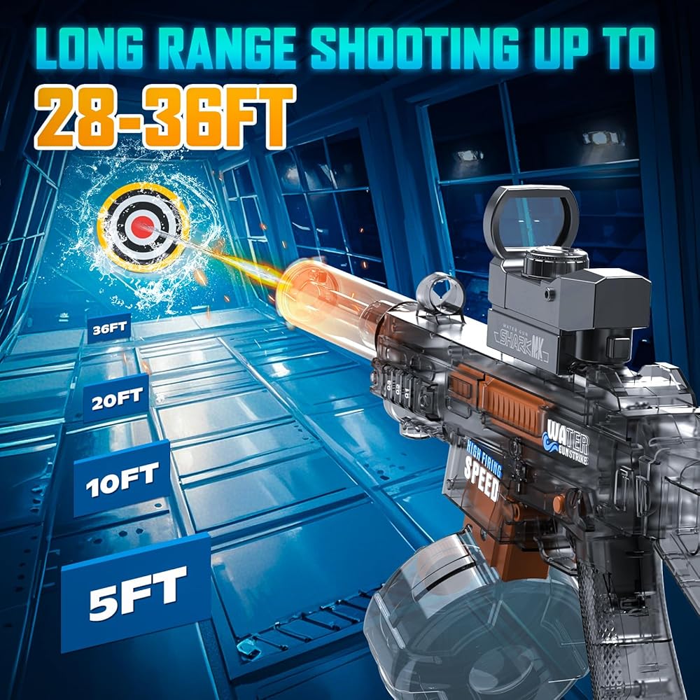 【قوة إطلاق نار سريعة ومسافة إطلاق طويلة】 يعمل قاذف المياه الكهربائي الخاص بنا على تعزيز محركه لإطلاق النار بسرعة البرق. إنها تطلق النار لمسافة أبعد من مسدسات المياه المشابهة الأخرى، ويمكنك إصابة هدفك من مسافة أطول بكثير، حيث يصل مداها إلى 24 إلى 32 قدمًا. بغض النظر عن مكان وجود خصمك، يمكنك بسهولة إغراقه في نطاق الرماية باستخدام مسدس الماء الأوتوماتيكي هذا. هذا المسدس الغني بالميزات هو سلاحك السري للفوز في كل معركة مائية.