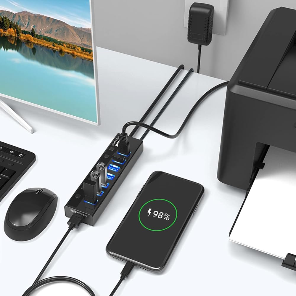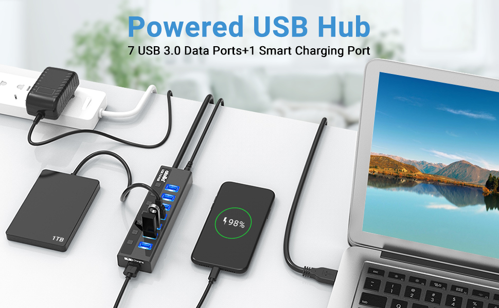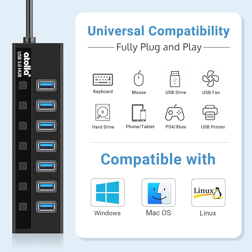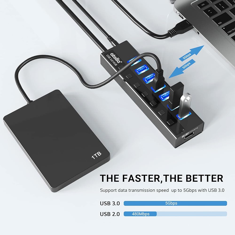 【موسع USB 】- يحتوي محور USB 3.0 الذي يعمل بالطاقة atolla على 7 منافذ USB 3.0 لنقل البيانات، بالإضافة إلى منفذ شحن ذكي واحد. يمكن استخدام منافذ بيانات USB المدعومة من OTG لتوسيع الماوس ولوحات المفاتيح الخارجية والطابعات والأقراص الصلبة وما إلى ذلك.