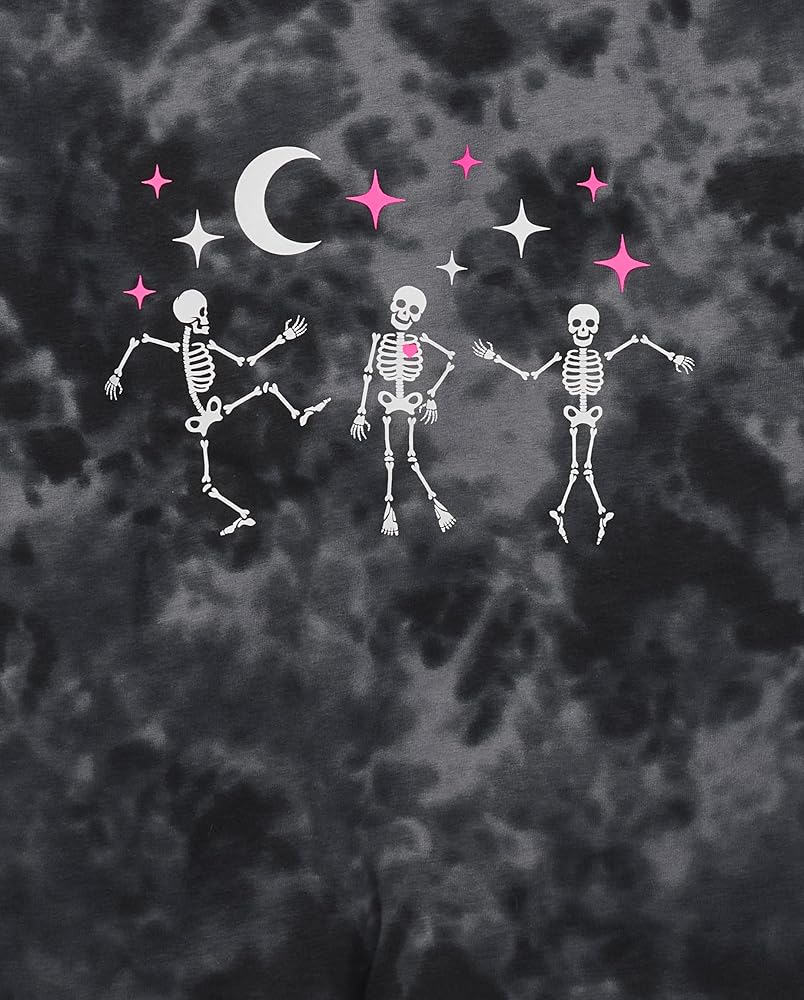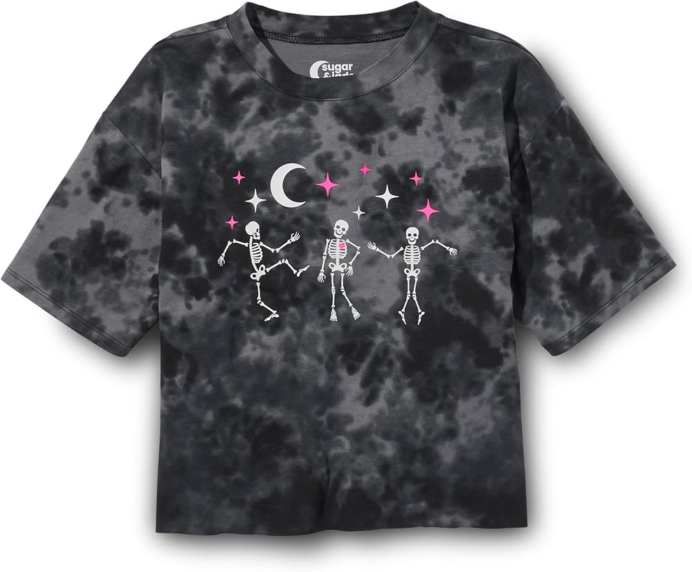 DESIGN — Features short sleeves, oversized fit, rib-knit crew neck, allover tie dye and dancing skeletons graphic design at front. Allover tie dye is unique to each style and may have a slight variance.