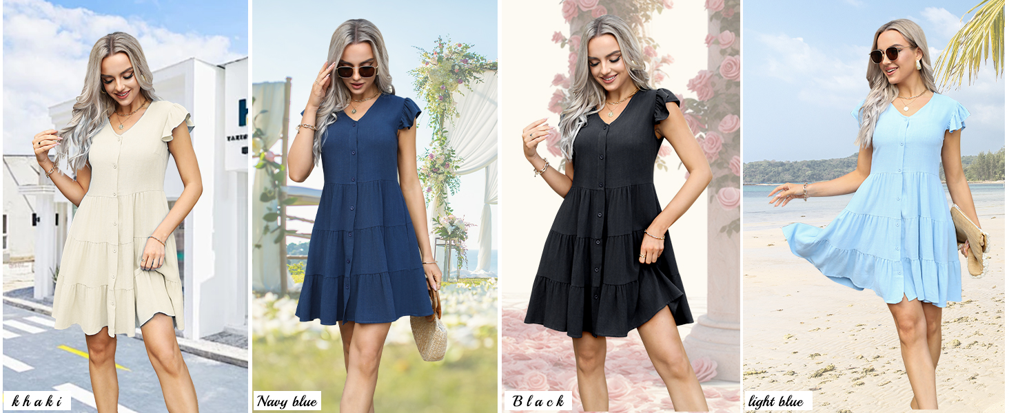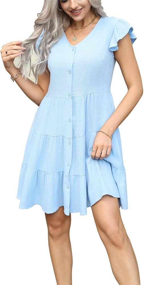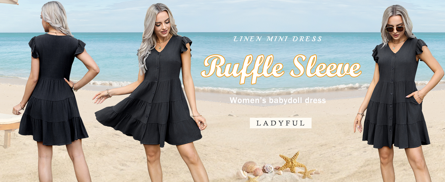 فستان قصير من الكتان للنساء مصمم بأزرار سفلية، وأكمام قصيرة مكشكشة، بدون أكمام، وجيبين على الجانب المزدوج، وطبقات، وأرجوحة انسيابية، وطول فوق الركبة، وفستان قصير.