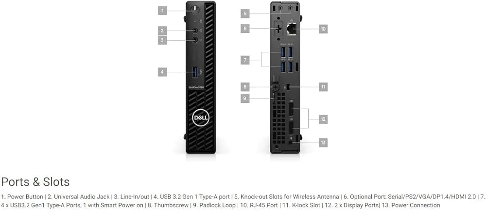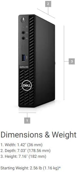 Key Features and Benefits: CPU: Intel Core i5-10500T Processor (6 Cores, 12MB Intel Smart Cache, 12 Threads, Base Frequency at 2.30 GHz, up to 3.80 GHz at Maximum Turbo Speed) Memory: 32GB DDR4 Memory Hard Drive: 1TB PCIe NVMe M.2 Solid State Drive Video: Intel UHD Graphics 630 Operating System: Microsoft Windows 11 Pro Ports: 1 x USB 3.2 and 4 x USB 3.2 (1 front/4 rear), 2 x Display Ports, 1 x RJ-45, 1 x Universal Audio Jack, 1 x Line-In/out, 1 x Wireless Antenna Optical Drive: None Wireless Connectivity: Intel Wi-Fi 6 AX201 2x2 802.11ax 160MHz + Bluetooth Dimensions & Weights: 7.16" X 7.03" X 1.42"; 2.56 lbs Wired Mouse & Keyboard: Yes Color: Black