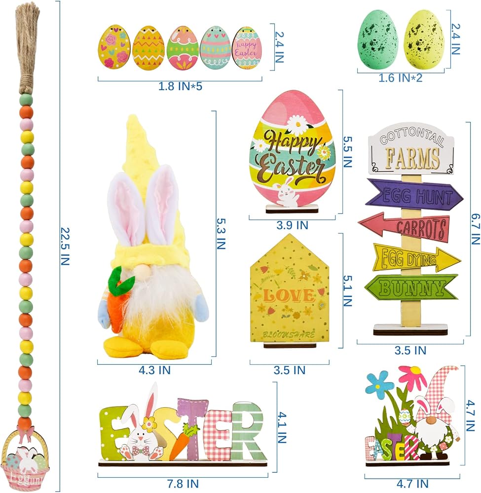 🐇 مجموعة ديكورات عيد الفصح القيمة: تحتوي على 1 قطيفة لطيفة على شكل جنوم، 1 إكليل خرز، 2 بيضة عيد الفصح، و10 لافتات خشبية، تتضمن 5 قطع لافتات خشبية على شكل بيضة يمكن ربطها معًا، 1 قطعة لافتة خشب بيضة، 1 قطعة على شكل منزل. لافتة خشبية "Love"، قطعة واحدة "عيد الفصح" ولافتة خشبية أرنب، قطعة واحدة لافتة خشبية جنوم وقطعة واحدة لافتة خشبية مؤشر يمكن للجميع الوقوف عليها. (صينية ذات طبقات غير متضمنة).