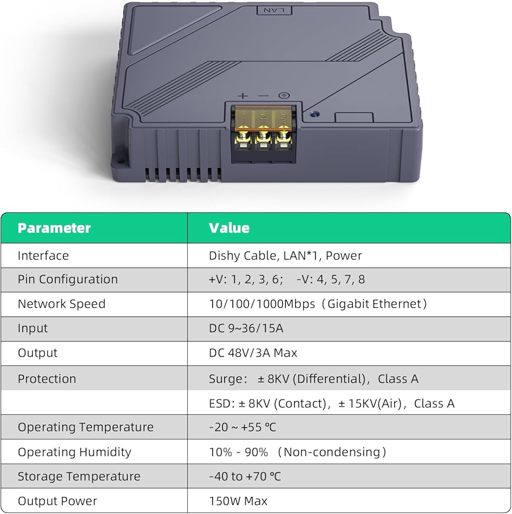 【 حاقن GigE PoE بقدرة 150 واط لشبكة Starlink الفضائية 】: يوفر ما يصل إلى 150 واط من الطاقة لضمان إمداد طاقة مستقر للقمر الصناعي Starlink Dish V2 Internet Kit، مما يضمن موثوقية اتصال الشبكة؛ يدعم سرعة الشبكة 10/100/1000 متر للبيانات السريعة الإرسال، ويدعم أيضًا أربعة أزواج من شبكة جيجابت إيثرنت، مما يحقق سرعات نقل بيانات أسرع ويضمن اتصالات شبكة أسرع وأكثر استقرارًا