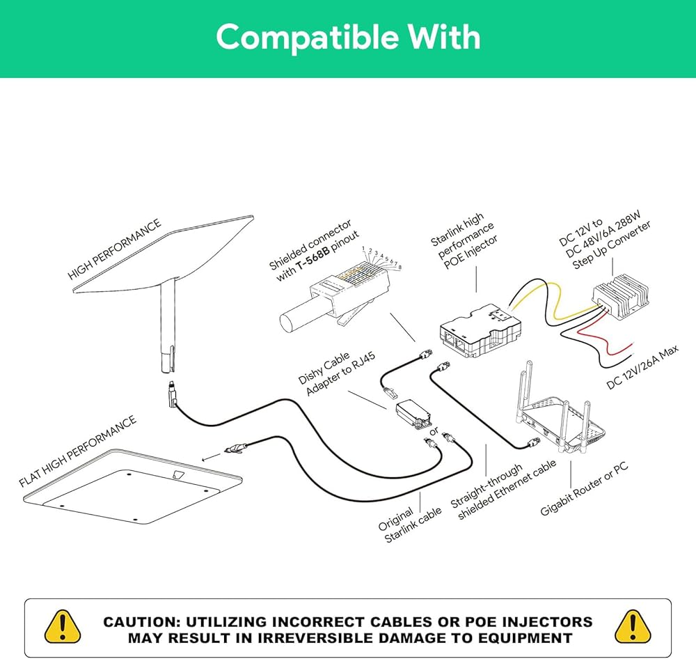 【 الأجهزة المتوافقة 】: متوافقة مع Starlink عالي الأداء/Starlink Flat عالي الأداء؛ يعمل فقط مع حاقن Starlink PoE بقدرة 320 وات مع علبة من الألومنيوم ومحول كابل طبق Starlink إلى RJ45 مع علبة من الألومنيوم (رابط Amazon: https://www.amazon.com/dp/B0D1R5NNWX)