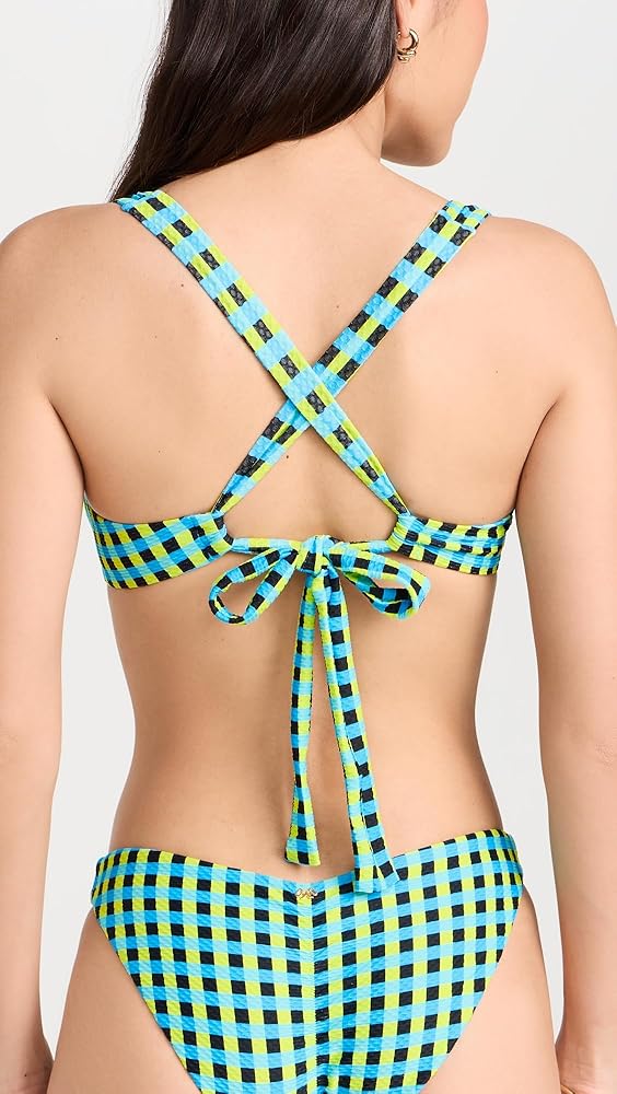 - نسيج منسوج، نمط مربعات، خط عنق على شكل رسن، أربطة متقاطعة في الخلف