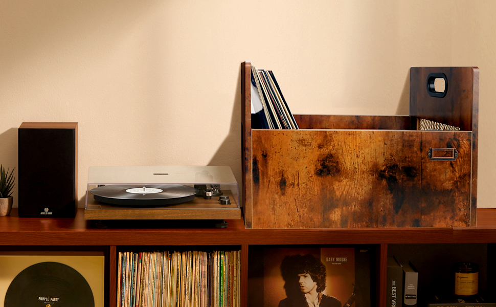 【سعة أكبر】يبلغ حجم صندوق تسجيل الفينيل الخاص بنا 17 بوصة × 13 بوصة × 11.8 بوصة، والذي يمكنه استيعاب ما يصل إلى 85 سجلًا من الفينيل، مما يوفر لك المساحة وإنشاء زاوية فنية أنيقة ومنظمة.