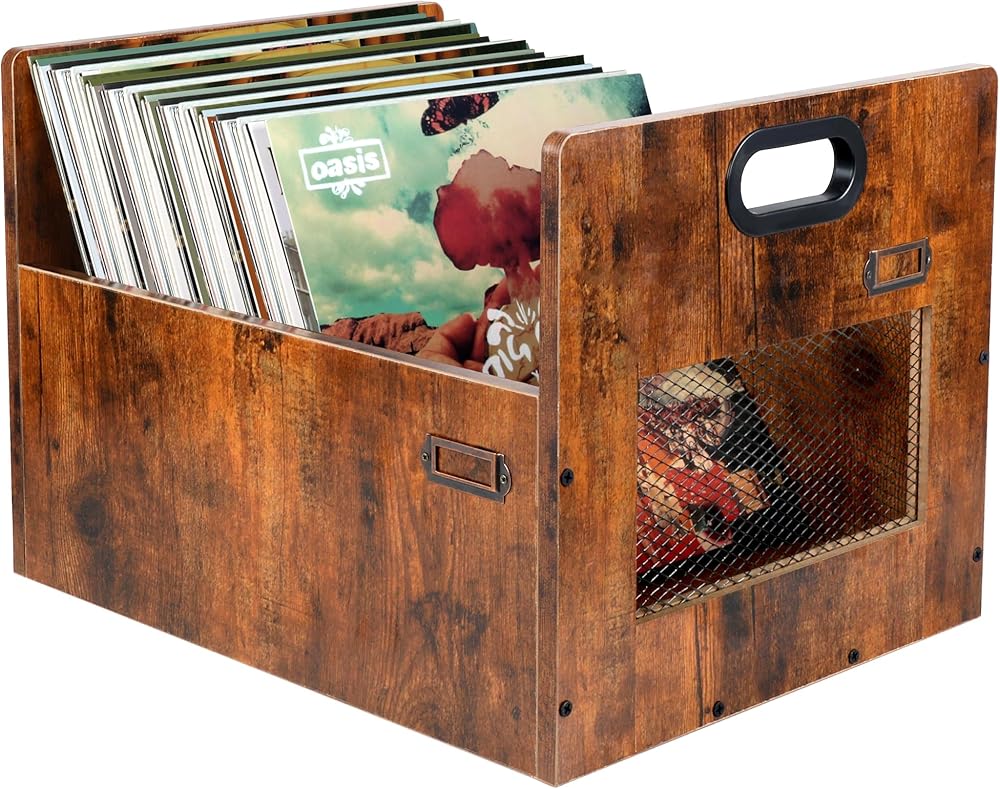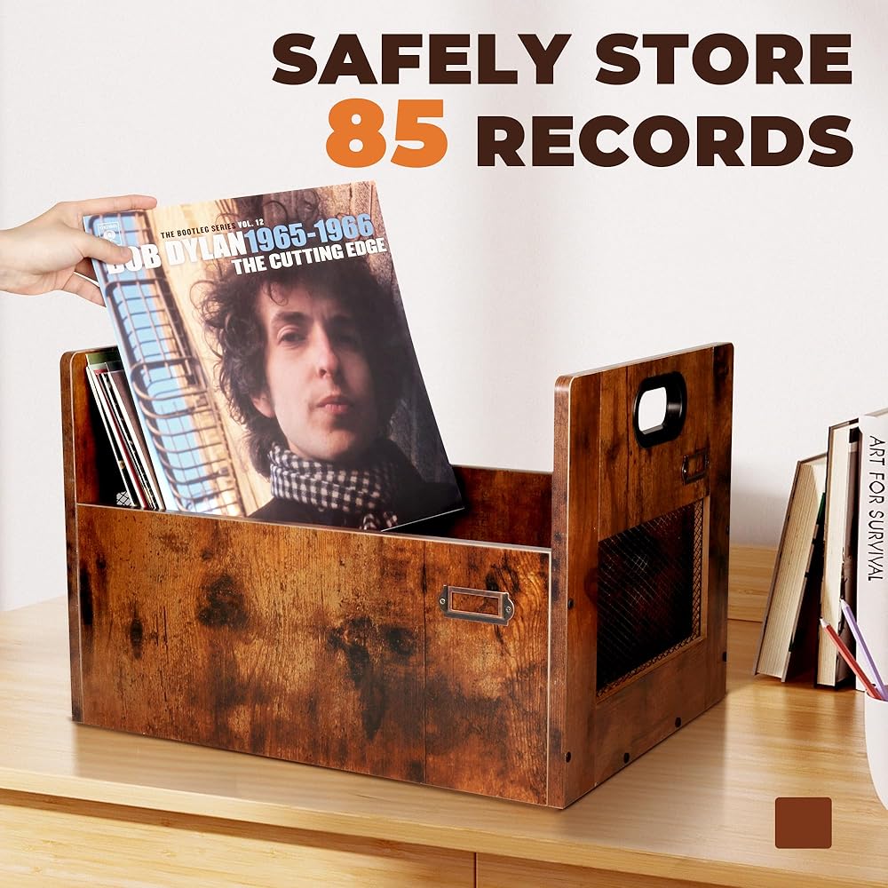 منظم تخزين سجل الفينيل، صندوق تخزين سجل Lp، رف حامل سجل للألبومات بمقبض، يحمل ما يصل إلى 85 سجلًا، تخزين ألبوم سجل خشبي عتيق لسجلات الفينيل وملفات الكتب