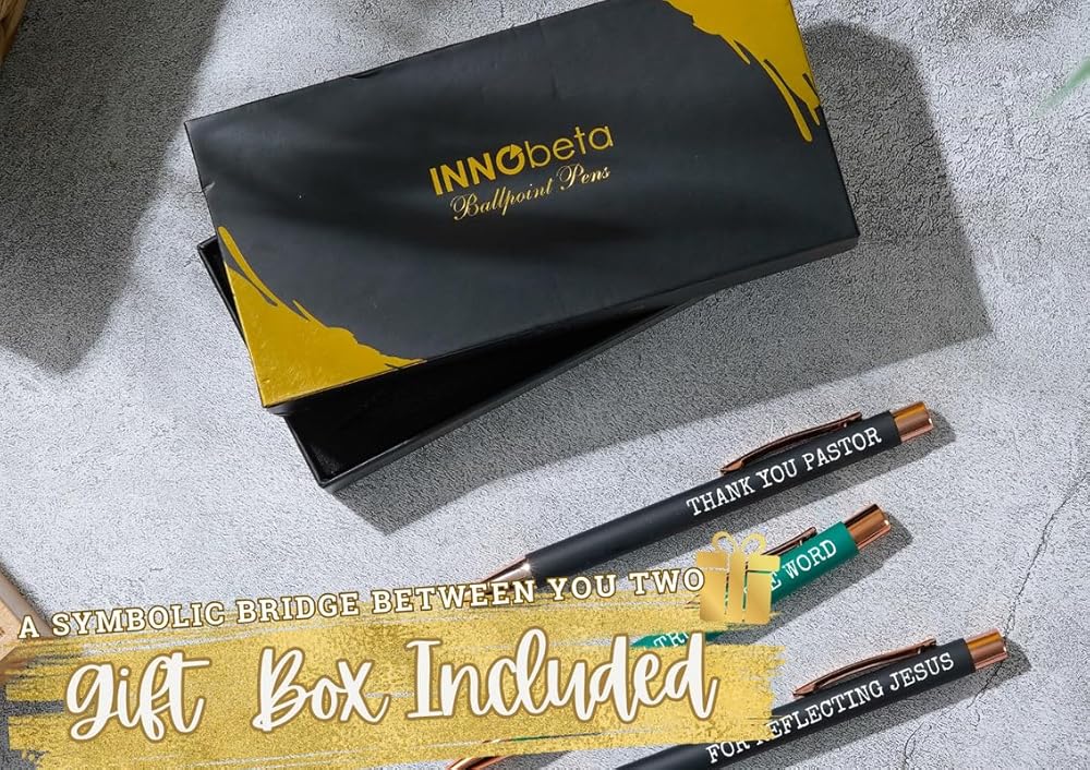 This gift box comes with four ballpoint pens, each featuring a unique inscription, making it a highly personalized gift. The four inscriptions are labeled as 'thank you pastor', 'for being true to the word', 'for reflecting jesus', and 'for being a blessing'.