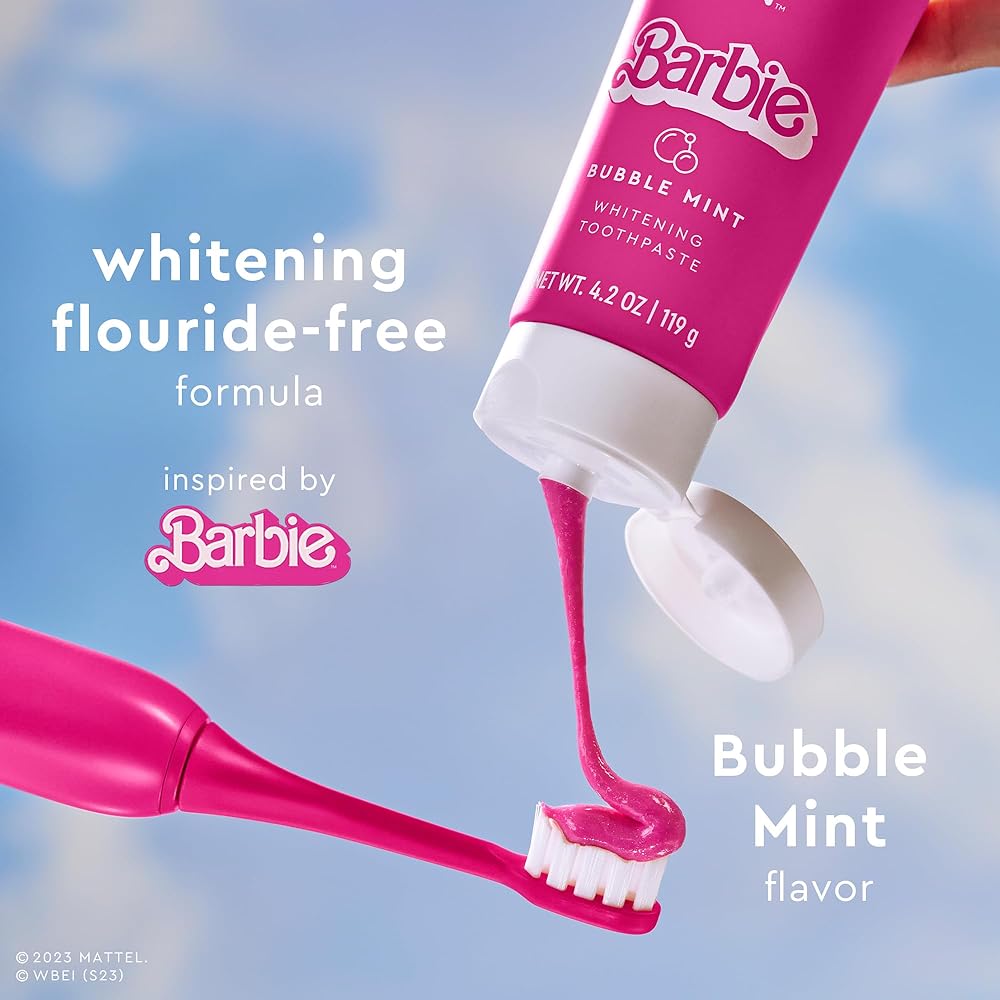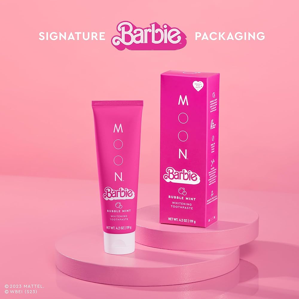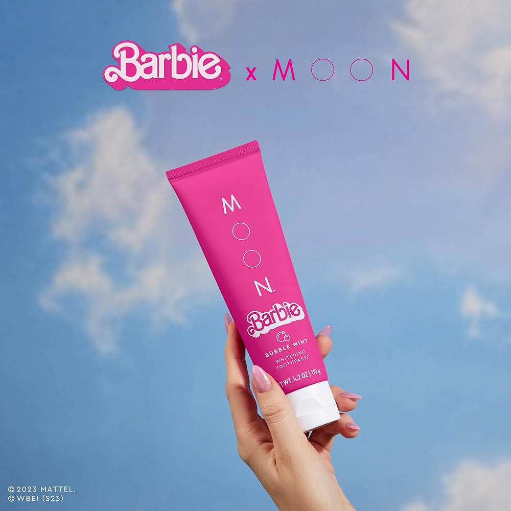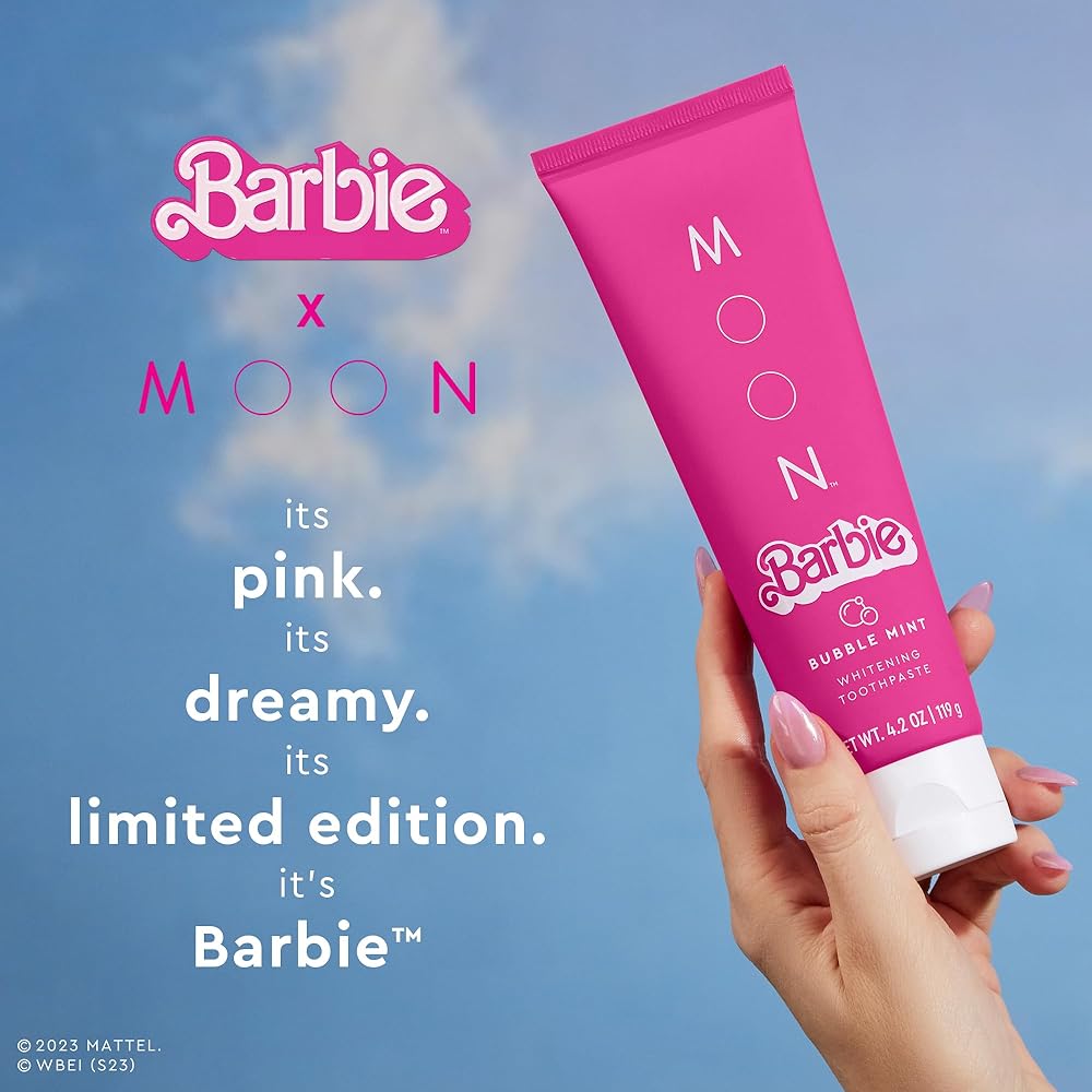 معجون أسنان تبييض الأسنان باربي × مون بابل مينت. مستوحى من باربي، يعمل معجون الأسنان الوردي اللامع هذا على تفتيح الأسنان للحصول على ابتسامة باربي المميزة. تتميز هذه التركيبة بمزيج مضاد للأكسدة خاص بـ Elixir X لتقليل البلاك ومنع أمراض اللثة وشفاء الأنسجة الرخوة في الفم. نكهة النعناع الفقاعية الحصرية للحصول على نفس منعش وحلاوة الزاهي. تأتي مع عبوة باربي المميزة للحصول على أفضل قطعة لهواة التجميع.