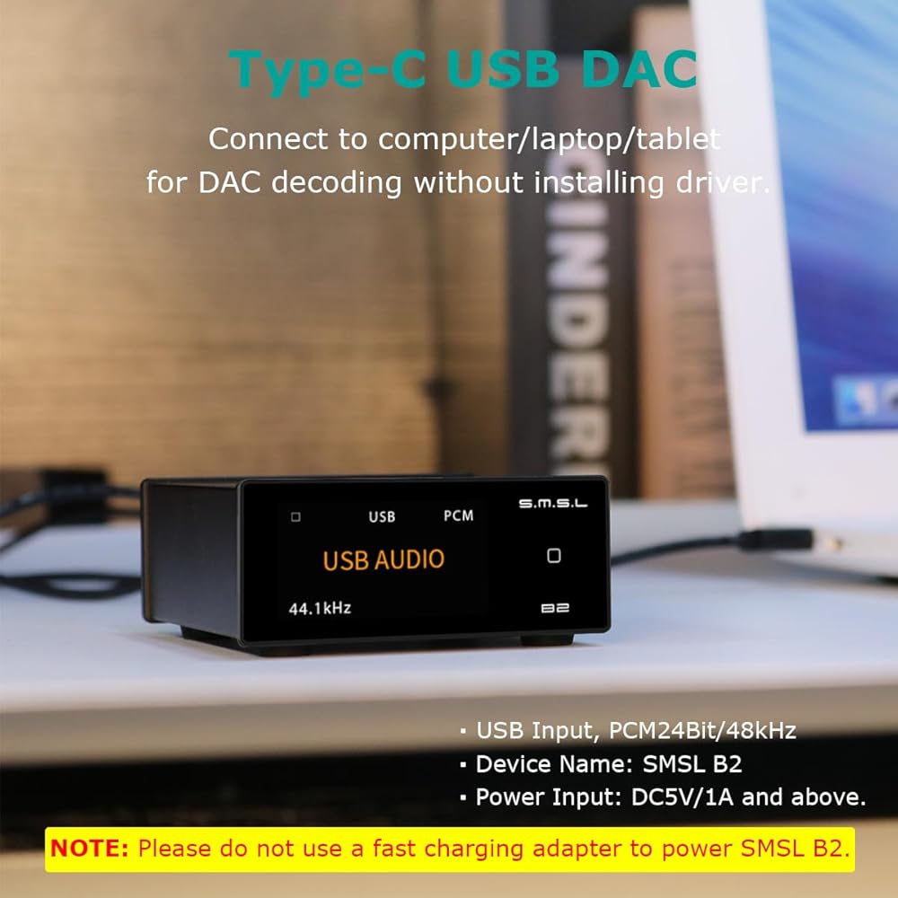 • 【USB Input & DC5V Power Supply】You can power the SMSL B2 directly by a USB C to A cable. The power input requires DC 5V 1A and above. Note: it is prohibited to use fast charging adapters to power it !