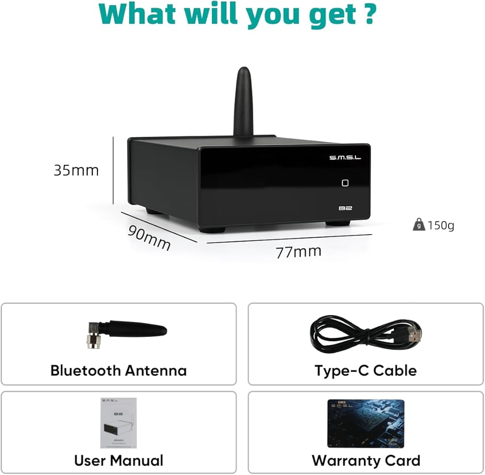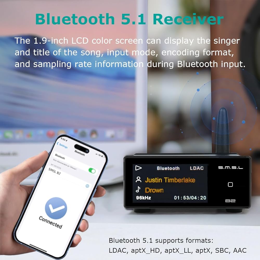 • 【1.9-inch Display Screen】SMSL B2 Bluetooth Audio converter utilizes a 1.9-inch LCD color screen, the singer and title of the song, input mode, encoding format and sample rate information are all display in a clear and concise manner when use Bluetooth input.