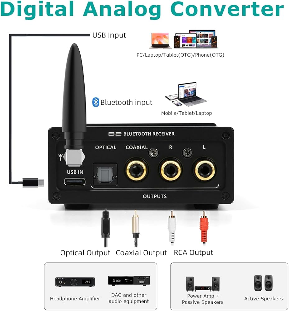 • 【Suitable for Multiple Occasion】SMSL B2 audio receiver Converter support for Bluetooth and USB input, Optical, coaxial and RCA output, you can directly connect your devices to amplifier or active speakers, easy to build your HiFi system.