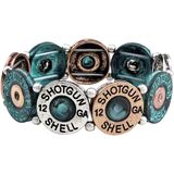 Who says a cowgirl can't be stylish? Fun and whimsical multi-toned stretch style fashion bracelet with shotgun shell heads. The words 12 GA SHOTGUN SHELL are etched in around the outer rings of each bullet. Absolutely stunning mixture of gold, copper and silver tones with a burnished finish giving off vintage vibes. Shotgun shells adorn the bracelet strand all the way around so you have a fabulous look from all angles!