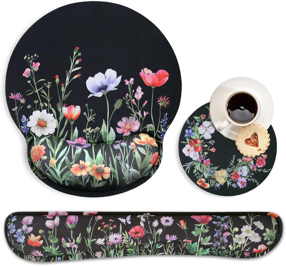 لوحة الماوس البرية مع راحة معصم ومجموعة راحة معصم لوحة المفاتيح ، وسادة الماوس المريحة للذاكرة ذات الأزهار السوداء للنساء ، وملحقات مكتب المكتب ، واستخدام الألعاب