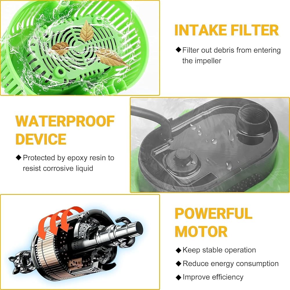 🎁【تصريف فعال للمياه الراكدة بنسبة 850 جيجا في الساعة】إنه خفيف الوزن، ويمكن غمره في الماء، ويمكن أن يتحرك حتى 850 جالون في الساعة، وله سرعة تصريف أسرع 1.5 مرة من مضخة الصرف القياسية. يوفر لك الكثير من الوقت ويمنع هدر الطاقة