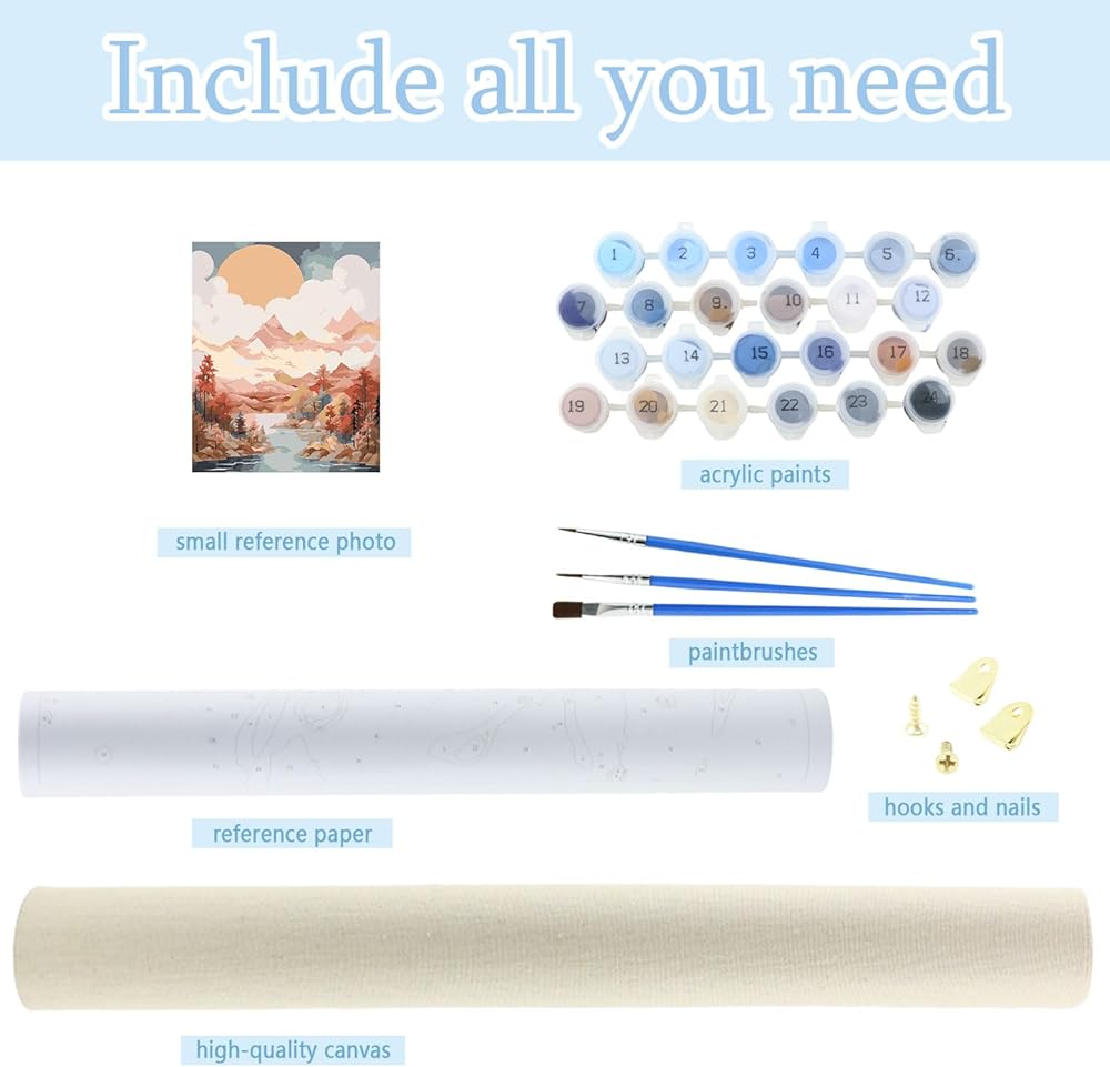 【مادة عالية الجودة】نحن نقدم قماشًا مطويًا بدون خياطة والدهانات عبارة عن طلاء أكريليك عالي الجودة، وغير سام، يوجد طلاء زيتي كافٍ لإكمال هذه اللوحة الرقمية، صندوق محكم الغلق مصمم خصيصًا يحافظ على الطلاء جديدًا ومرنًا لفترة أطول (من فضلك أغلق الصندوق بعد الاستخدام).