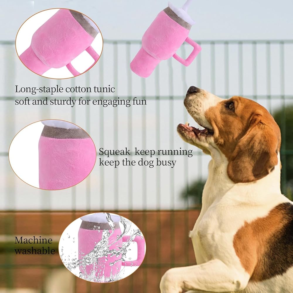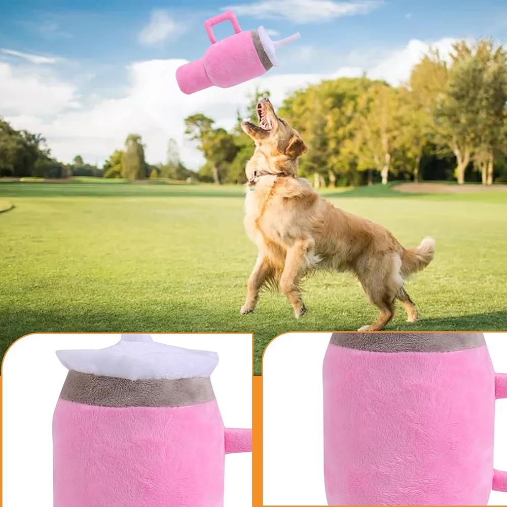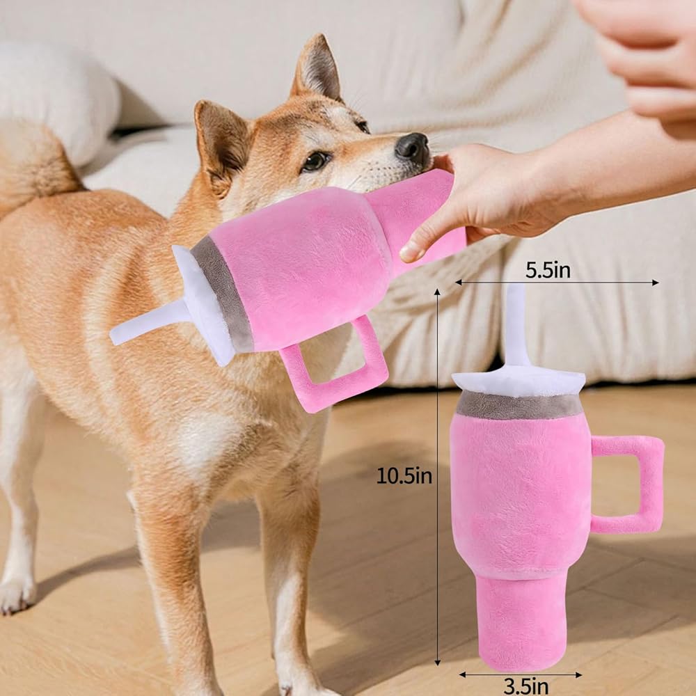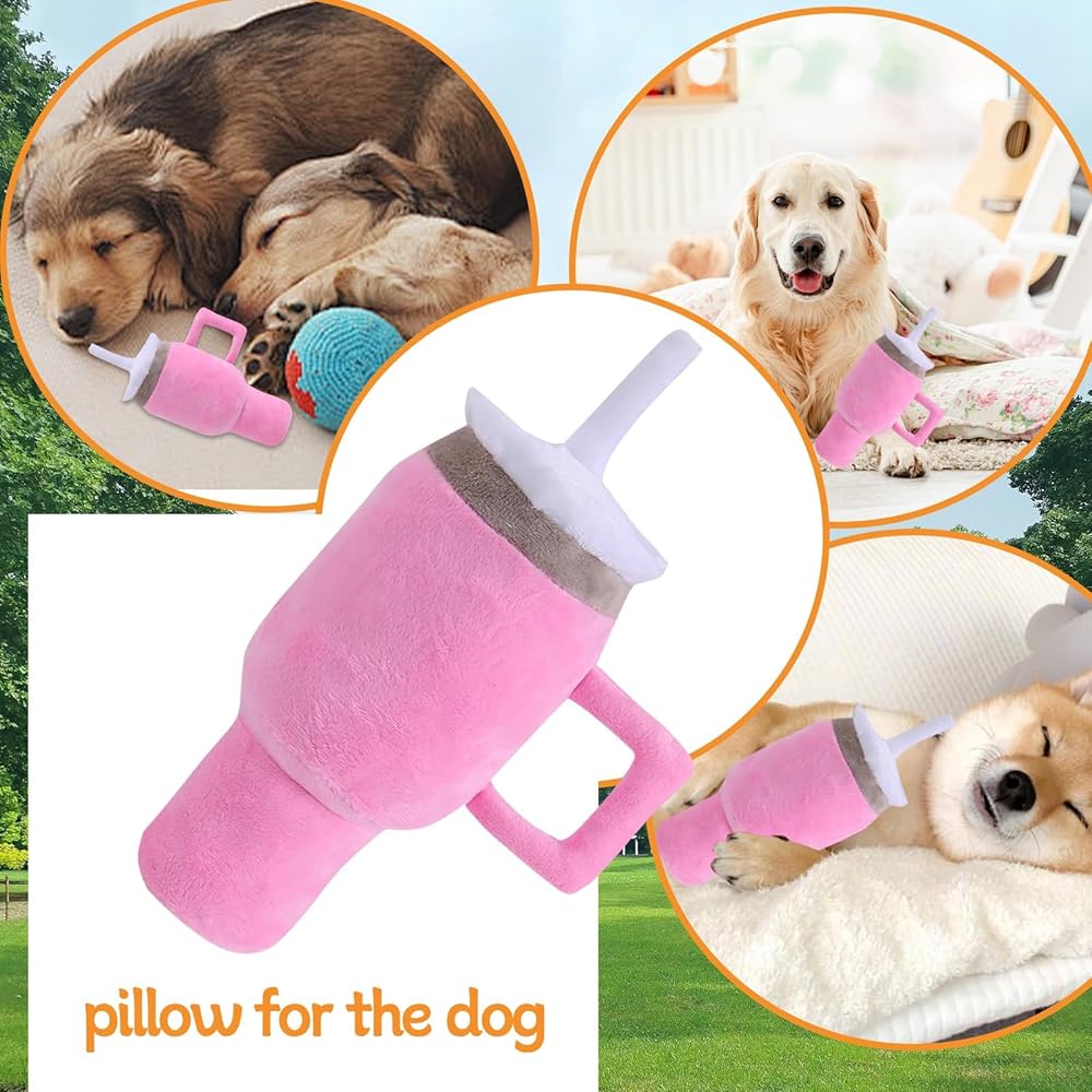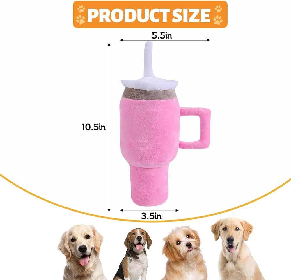 【Funny Dog Squkeay Toys】 This cute dog toys features a Tumbler design with a plush straw and handle, There is a squeaky ball embedded inside, which will immediately make a sound to attract the dog's attention whenever he bites it. This toy is perfect for cuddling and comforting your furry friend during rest time.