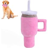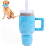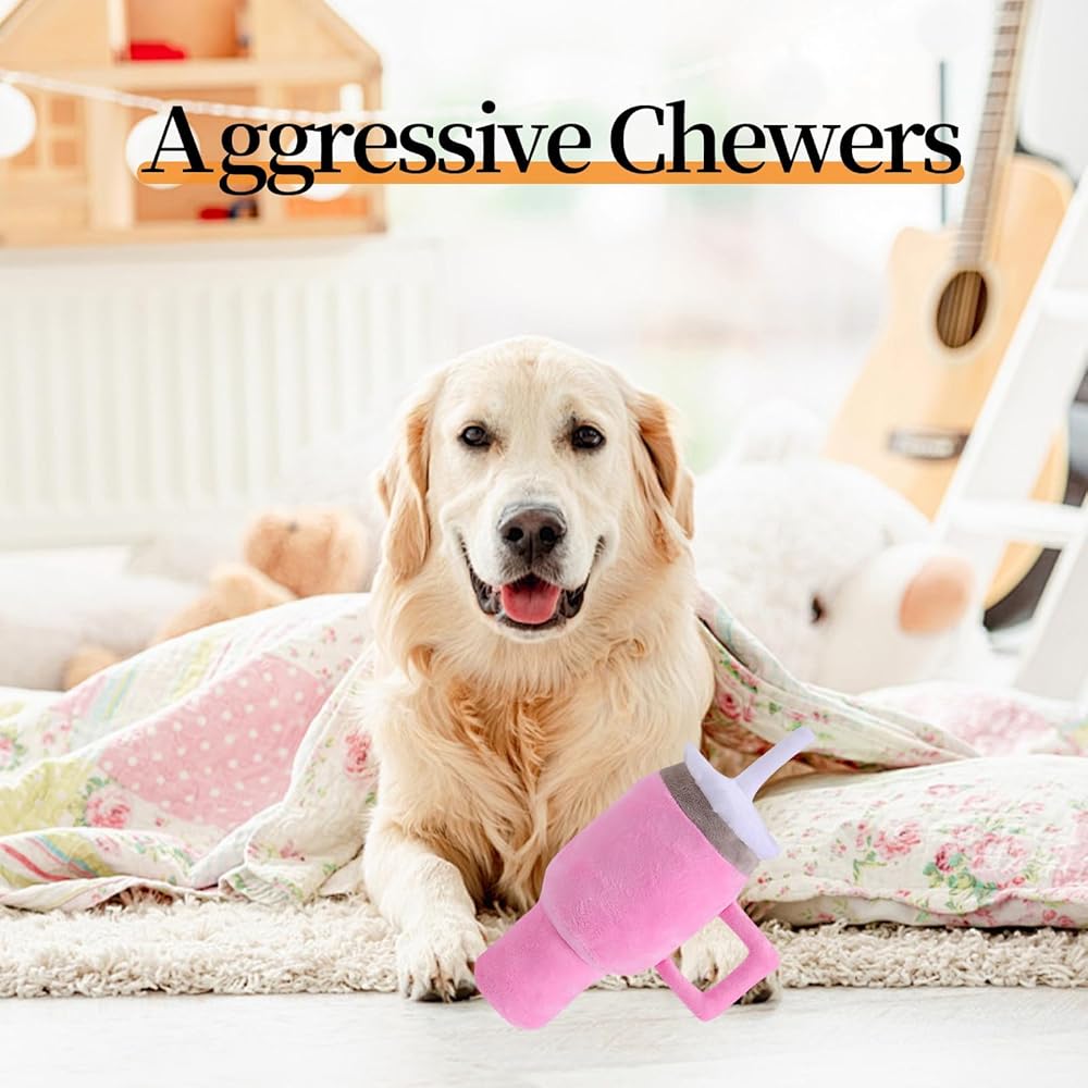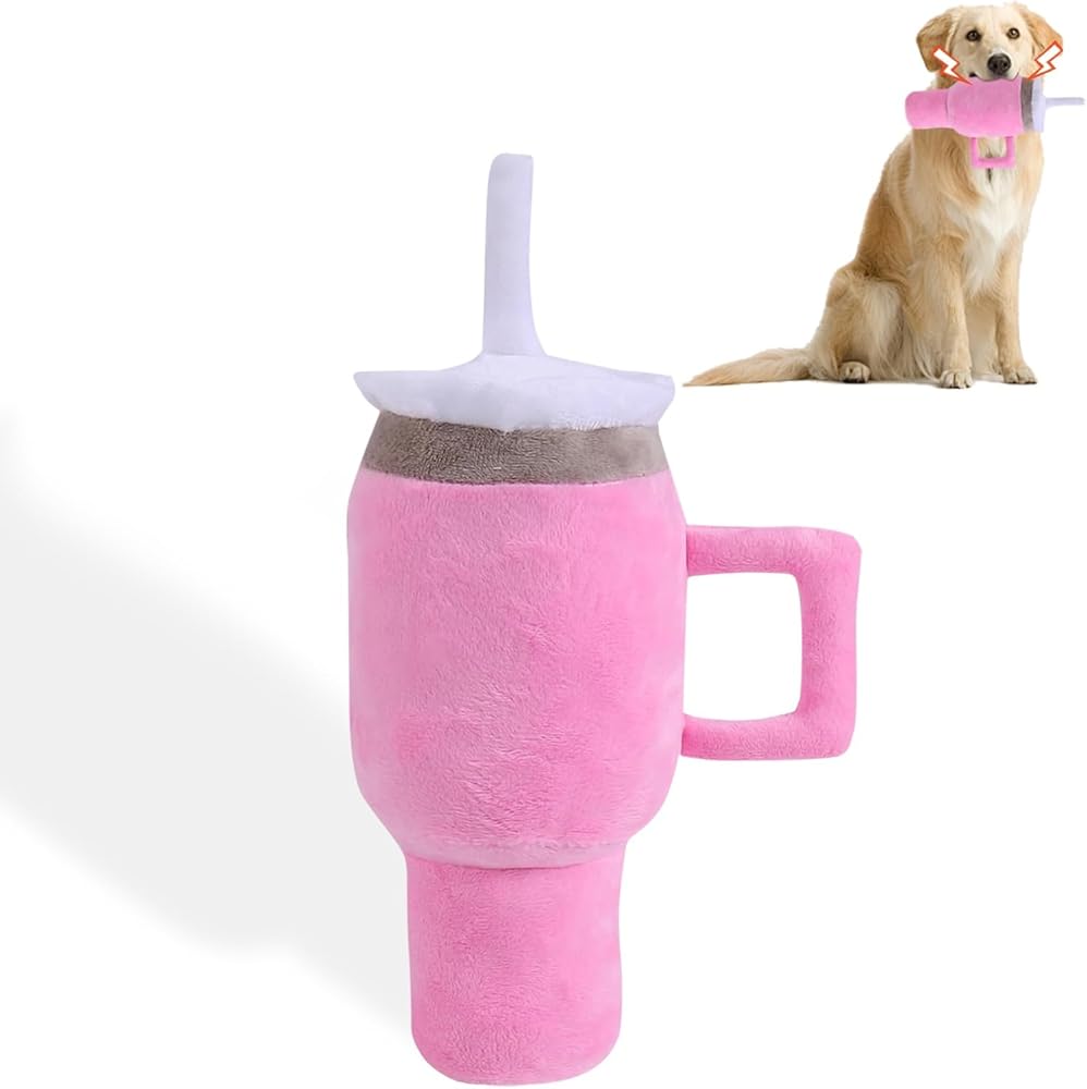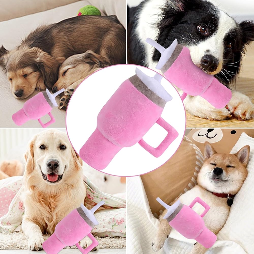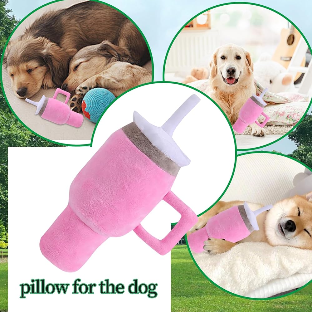 【Funny Dog Squkeay Toys】 This cute dog toys features a Tumbler design with a plush straw and handle, There is a squeaky ball embedded inside, which will immediately make a sound to attract the dog's attention whenever he bites it. This toy is perfect for cuddling and comforting your furry friend during rest time.