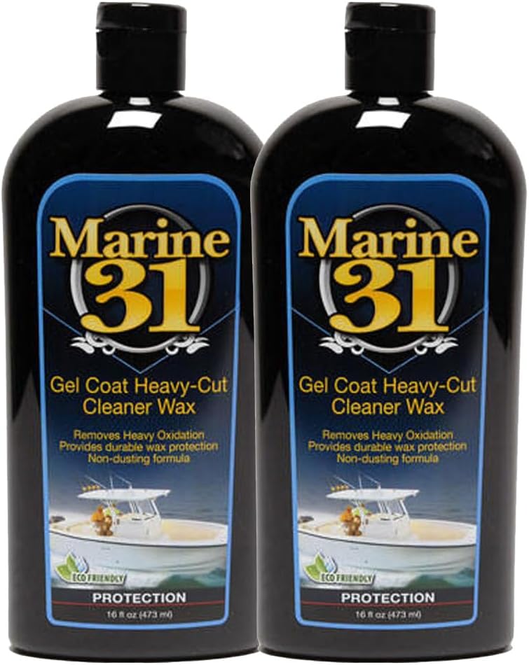 Marine 31 Gel Coat Heavy-Cut Cleaner Wax - Marine & Boat Voted best boat cleaner wax! Marine 31 Gel Coat Heavy-Cut Cleaner Wax is the perfect one-step solution for getting rid of moderate to heavy oxidation and staining on gel coat - standard and painted. Formulated using advanced micro-abrasives, proprietary cleaning agents and nourishing oils, Marine 31 Gel Coat Heavy-Cut Cleaner Wax maximizes color, gloss and surface smoothness while leaving a durable layer of high-gloss wax protection. Marine 31 Heavy-Cut Cleaner Wax is exceptionally easy to apply and buff off and its unique formula does not dust or cake up. Available in 16 Oz bottles or 32 Oz. bottles.