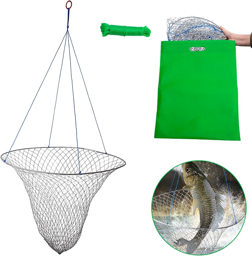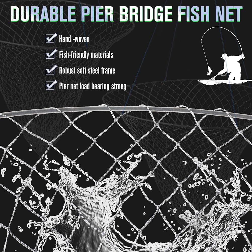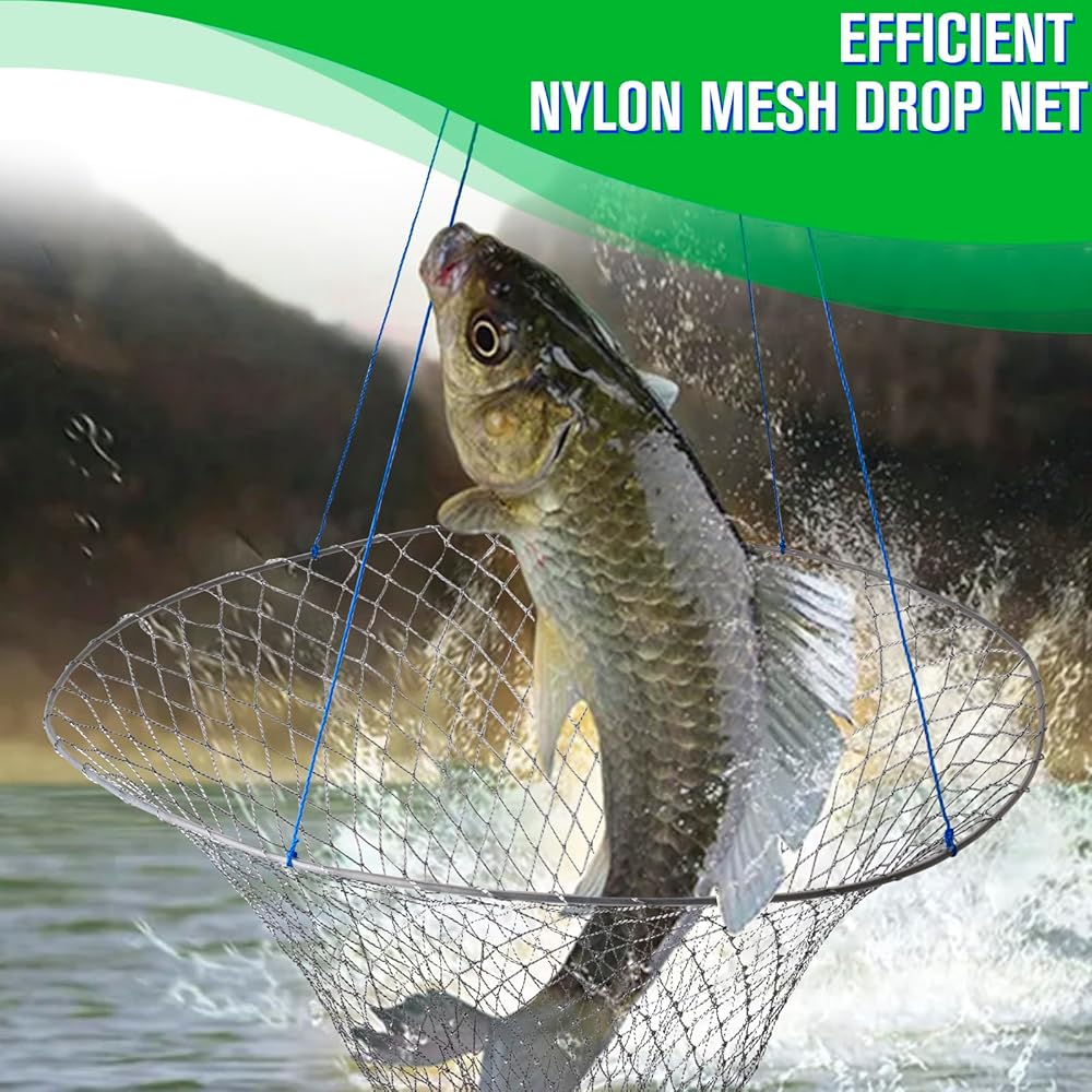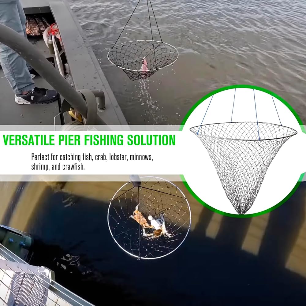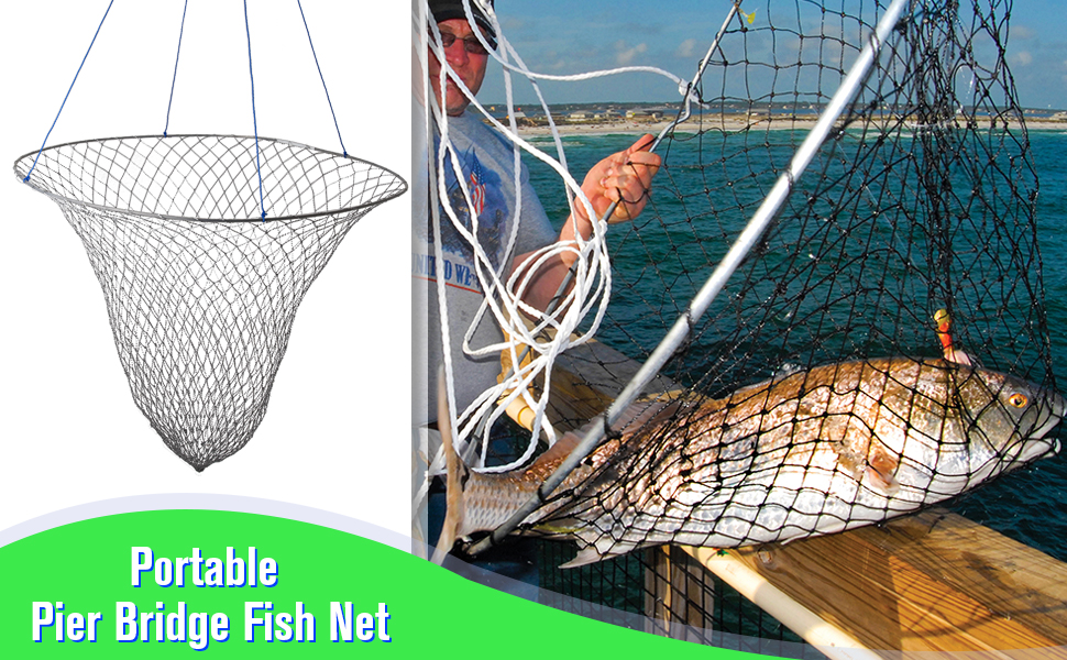 شبكة رصيف، شبكة إسقاط لصيد الرصيف، شبكة صيد الجسور بحبل، شبكة طوق سرطان البحر - شبكة هبوط رصيف قابلة للطي، مادة فولاذية ناعمة، شبكة من النايلون لسهولة التخزين (قطر 32 بوصة)