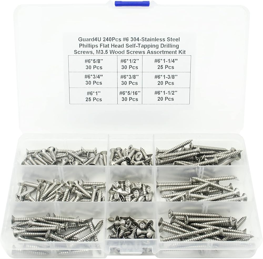 Guard4U 240Pcs #6/M3.5 304-Stainless Steel Phillips Flat/ Countersunk Head Self-Tapping Drilling Screws Assortment Kit