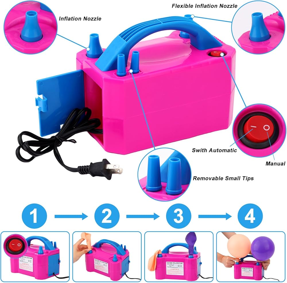 مضخة بالونات عملية: تتميز مضخة البالونات الكهربائية بقابس 110-120 فولت مدرج في قائمة UL وتم اختبارها لتكون آمنة لتجربة نفخ بالونات سلسة وآمنة. تحتوي على وضعين للضخ، وسيتم ضخ مئات البالونات في دقائق.