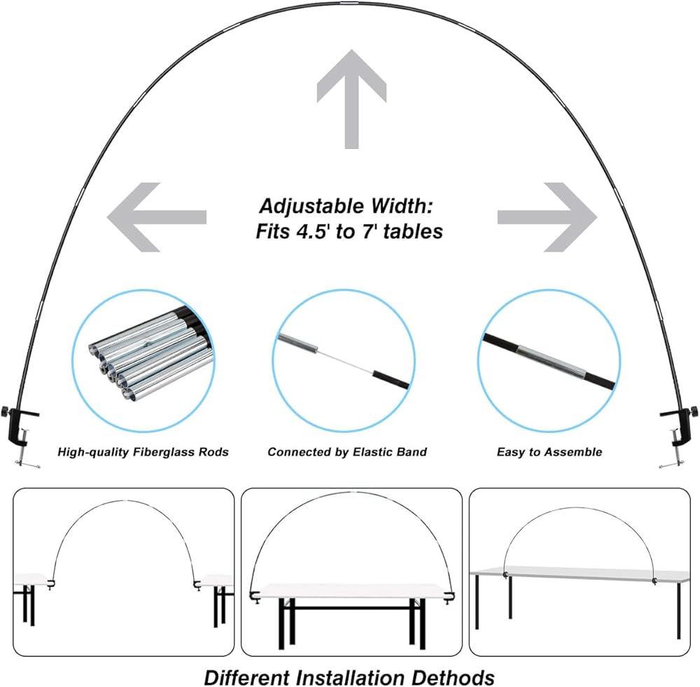 حامل ثابت: القضبان القابلة للطي مصنوعة من ألياف زجاجية قوية ومتينة، والتي ليس من السهل كسرها. أنابيب الدعم PVC المتصلة بقواعد صلبة وتضمن ثبات القوس. يتم توفير المسامير والحبال الأرضية للاستخدام في الهواء الطلق.