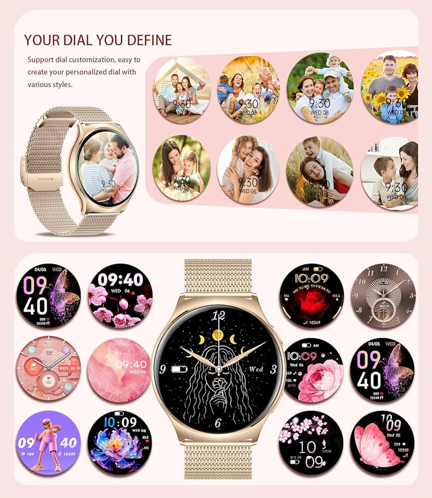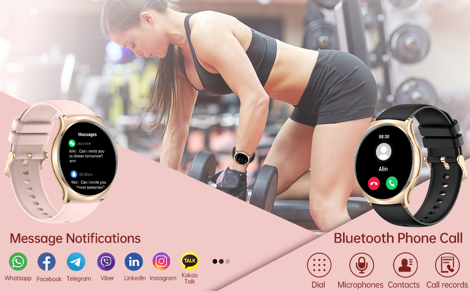 【ساعة ذكية يمكنها إرسال الرسائل النصية والمكالمات والإشعارات】ساعات ذكية للنساء مع مكبر صوت مدمج مقاوم للماء. بعد توصيل الساعات بالبلوتوث، يمكنك إجراء المكالمات والرد عليها ورفضها مباشرة من الساعة الذكية. (ساعة بلوتوث تدعم صوت الذكاء الاصطناعي) بالإضافة إلى ذلك، يمكن لساعة اللياقة البدنية النسائية عرض الرسائل والإشعارات من التطبيقات الأخرى (WhatsApp، Twitter، Facebook، Instagram، إلخ.) ساعة ذكية للنساء متوافقة مع Android أو iOS 9.0 وما فوق.