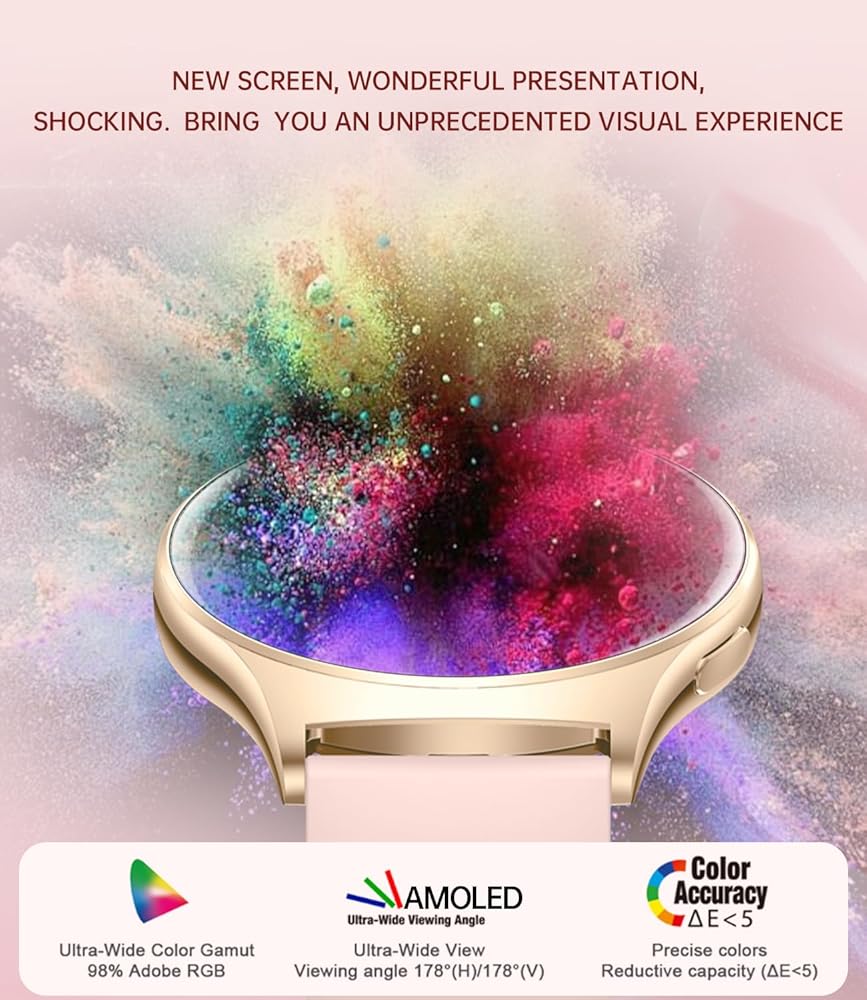 【شاشة ملونة ونمط متعدد الاستخدامات】تتميز الساعة الذكية بشاشة AMOLED مقاس 1.43 بوصة وأكثر من 200 قرص مدمج عبر الإنترنت. تدعم الساعات النسائية تحميل الصور الشخصية لإنشاء نمط شاشة فريد. توفر ساعات اللياقة البدنية للنساء مجموعة متنوعة من الوظائف الصغيرة المفيدة، بما في ذلك تشغيل الموسيقى وساعة التوقف والتدريب على التنفس والتقاط الصور عن بعد والآلة الحاسبة والتقويم وما إلى ذلك، مما يوفر لك تجربة ذكية أكثر ملاءمة وتنوعًا. (افتح تطبيق "FitCloudPro" واستكشفه)