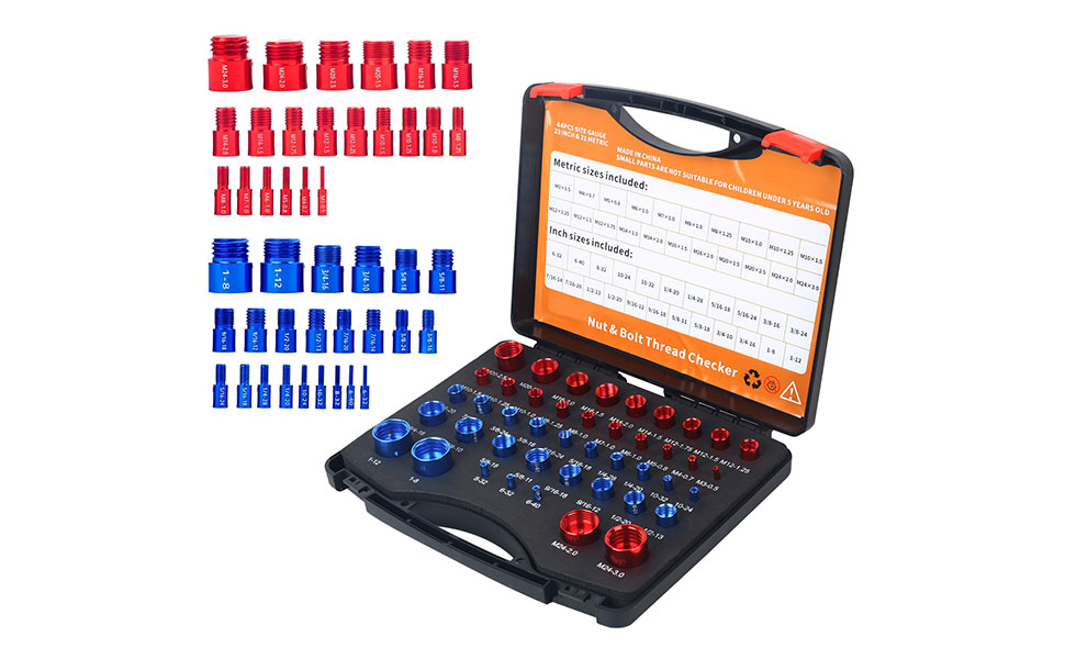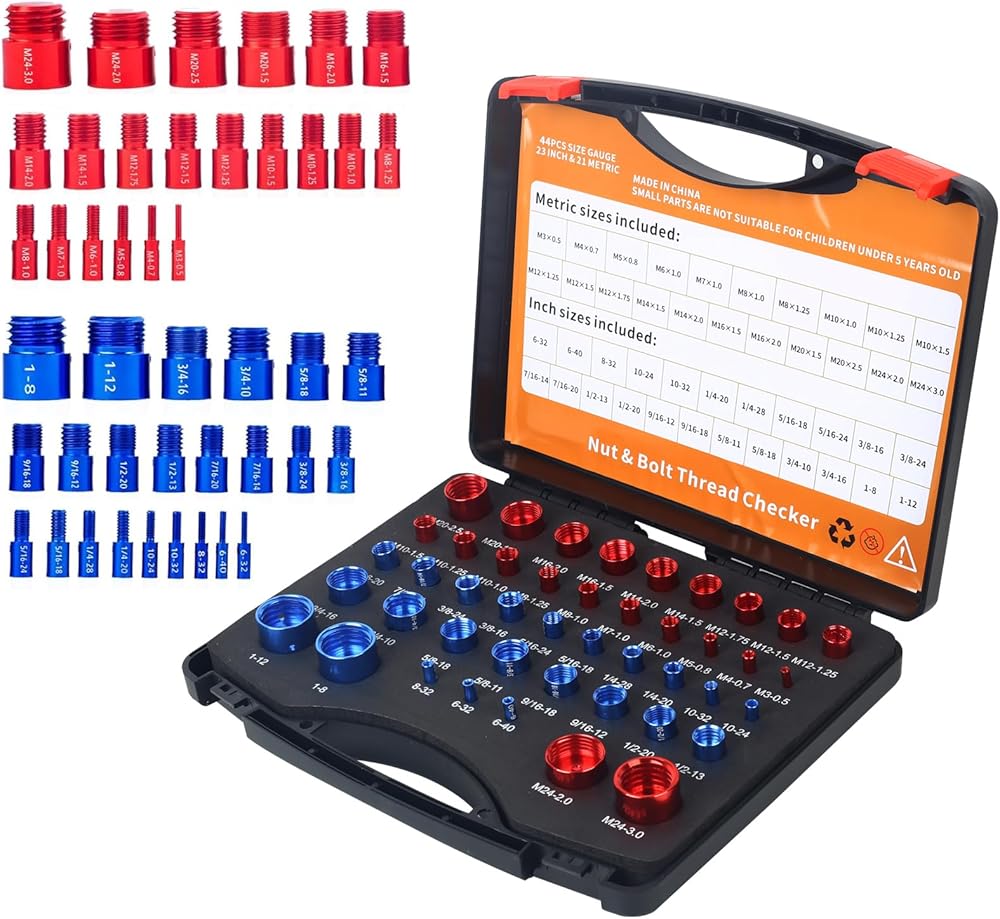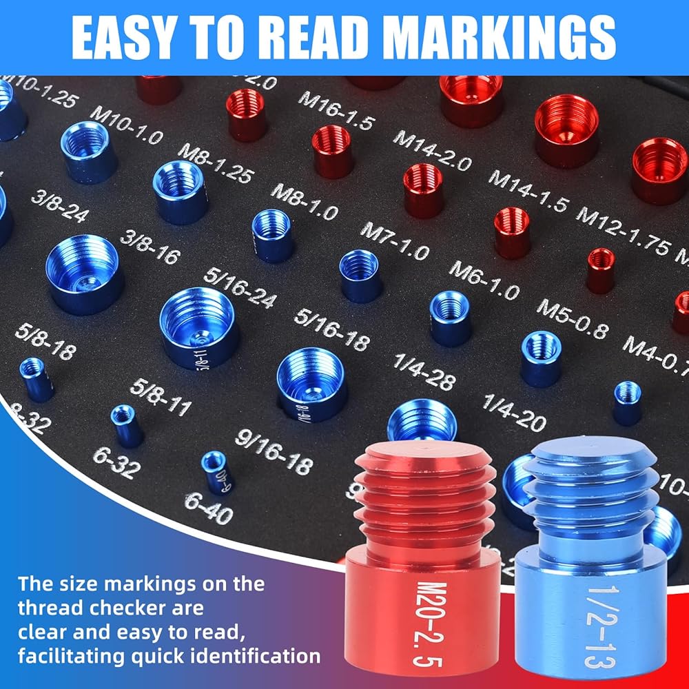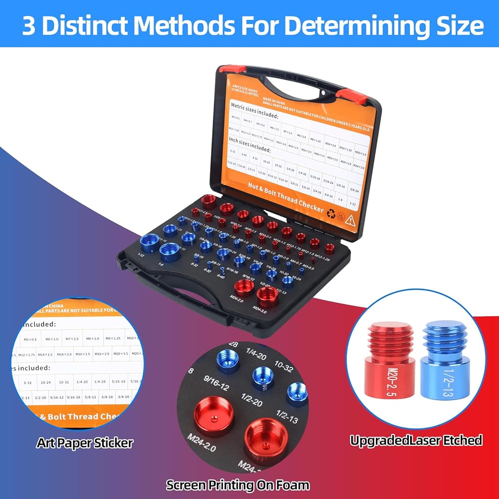 مجموعة قياس خيط الصواميل والمسامير الاحترافية - 23 بوصة و21 مقاسًا متريًا - تكتشف بسهولة البراغي الثابتة والثقوب الملولبة في المساحات الضيقة - مجموعة قياس الخيط الأحمر والأزرق للحصول على مقاس دقيق