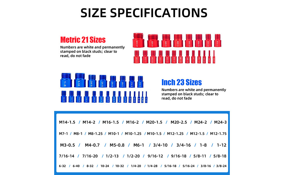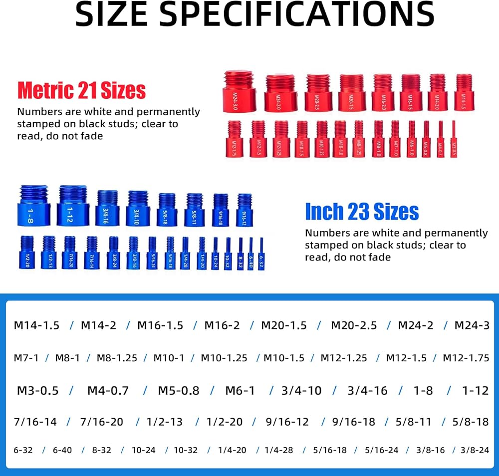 دقة الألومنيوم الأحمر للحجم المتري تمتع بالتميز في الحجم المتري مع مجموعتنا المطلية بالألومنيوم الأحمر، والتي تشمل 21 مقاسًا متريًا، بما في ذلك M3-0.5، M4-0.7، M5-0.8، M6-1.0، M7-1.0، M8-1.0، M8- 1.25، M10-1.0، M10-1.25، M10-1.5، M12-1.25، M12-1.5، M12-1.75، M14-1.5، M14-2.0، M16-1.5، M16-2.0، M20-1.5، M20-2.5، M24-2.0، M24-3.0. تم تصميم كل مقياس بعناية لقياس فعال، مما يوفر تنوعًا في مجموعة واحدة مدمجة.