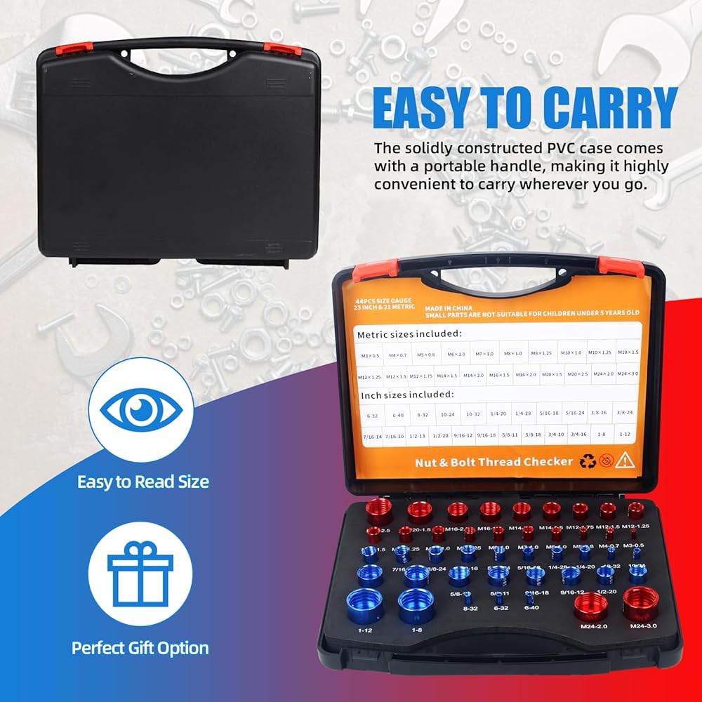تنظيم فعال لأدواتك قم بتبسيط مساحة العمل الخاصة بك من خلال مجموعة فحص الخيوط التي تتميز بـ 44 مقياسًا للذكور والإناث. قم بتنظيم الصواميل والمسامير المتنوعة الخاصة بك بشكل أنيق في صندوق مقصورتك، مما يمنع سوء الوضع والخسارة. مثالية لمستخدمي أدوات التثبيت المتكررة أو أولئك الذين لديهم مرآب مليء بالأجهزة.