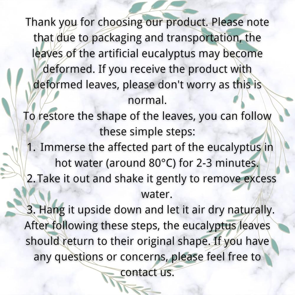 • متعدد الاستخدامات وأنيق: يعد رذاذ الأوكالبتوس الصناعي الخاص بنا إضافة أنيقة لأي مساحة - سواء كان منزلك أو مكتبك أو حفل زفاف أو مناسبة. يتيح تصميمه متعدد الاستخدامات إمكانيات تزيين لا حصر لها، ويمتزج بسلاسة مع مختلف الأنماط والمواضيع.