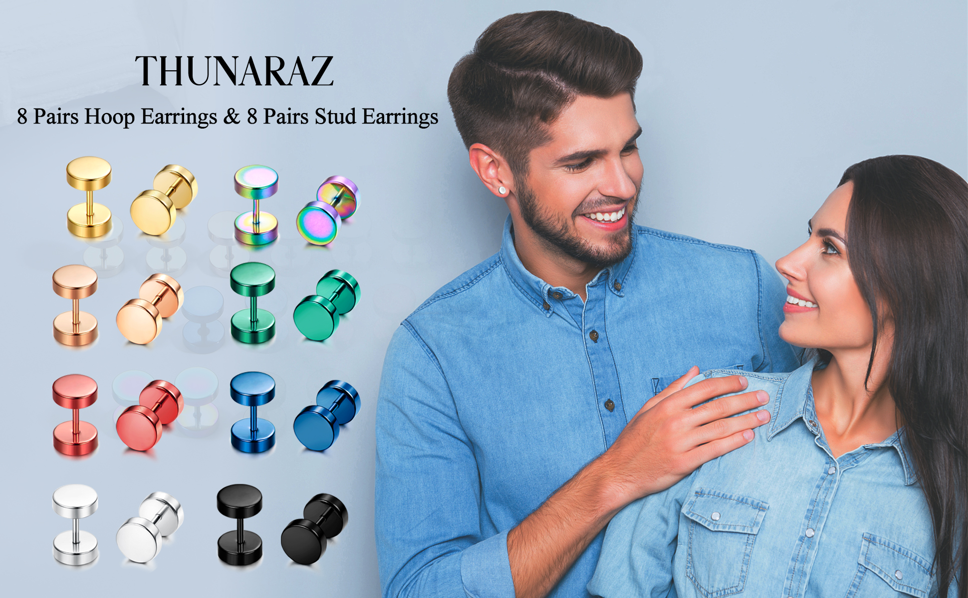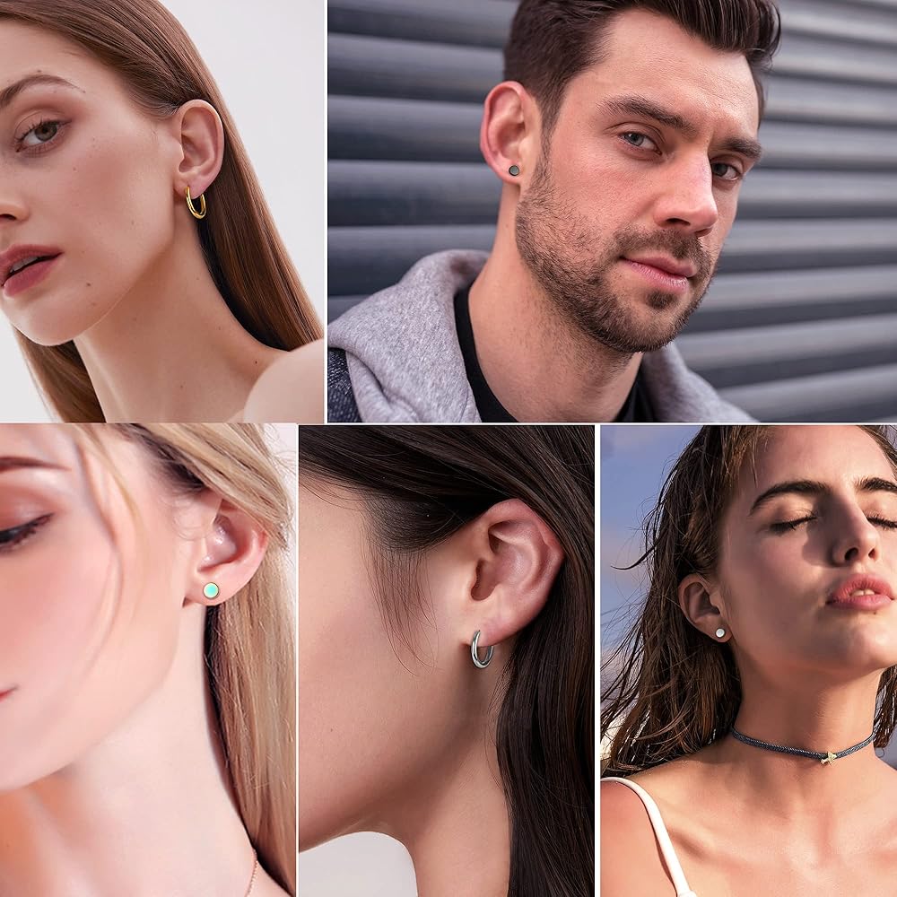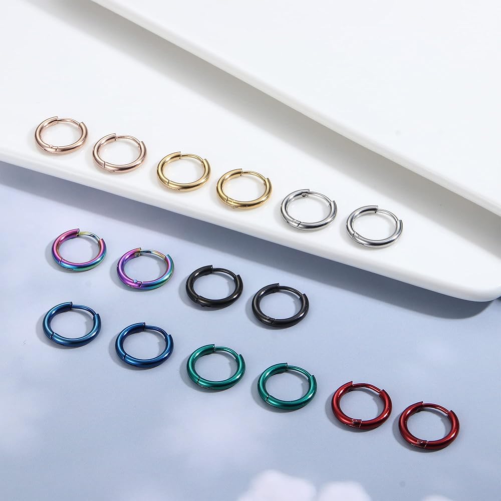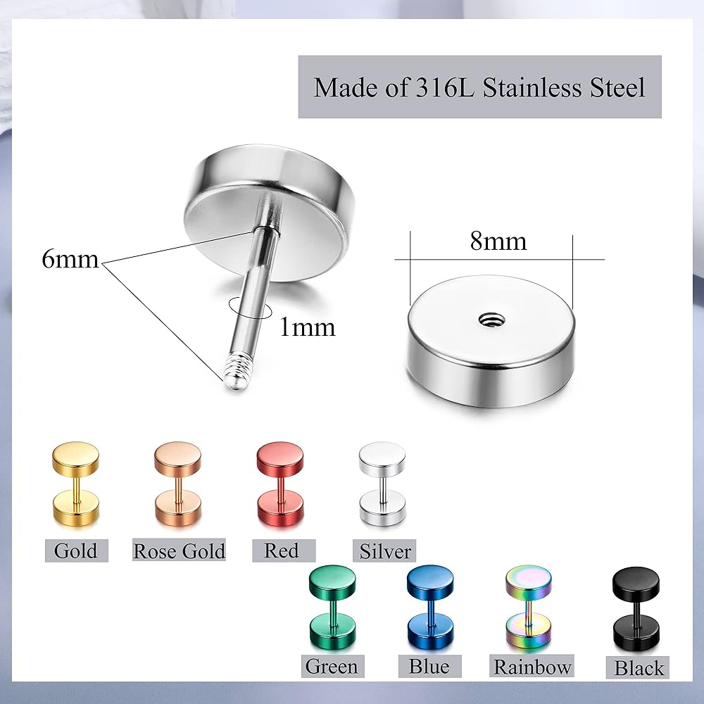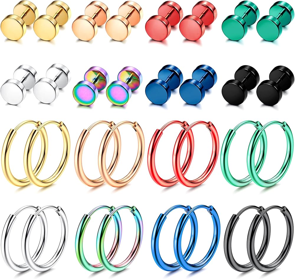 مجموعة أقراط من الفولاذ المقاوم للصدأ - طلب واحد سوف تحصل على 16 زوجًا من الأقراط المصنوعة من الفولاذ المقاوم للصدأ، بما في ذلك 8 أزواج من الأقراط الصغيرة و8 أزواج من الأقراط ذات القياس المزيف. ألوان مختلفة تأتي مع الذهبي / الفضي / الأخضر / الأحمر / الأزرق / الأسود / قوس قزح / الذهب الوردي، يمكنك مزجها وملاءمتها مع محتوى قلبك.