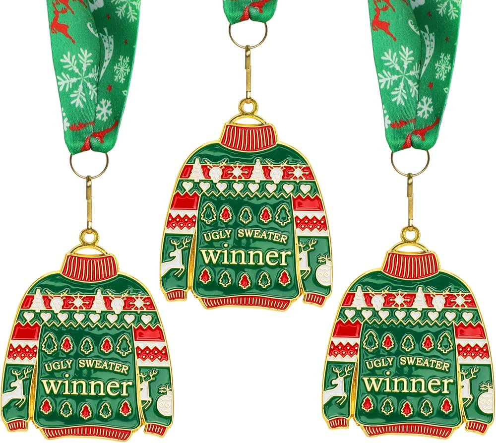 3 قطع من ميدالية سترة قبيحة لعيد الميلاد وشريط رقبة على شكل عيد الميلاد، ميداليات مسابقة جائزة زخرفة شجرة عيد الميلاد لحفلة مسابقة سترة قبيحة، جائزة أفضل سترة عيد الميلاد القبيحة