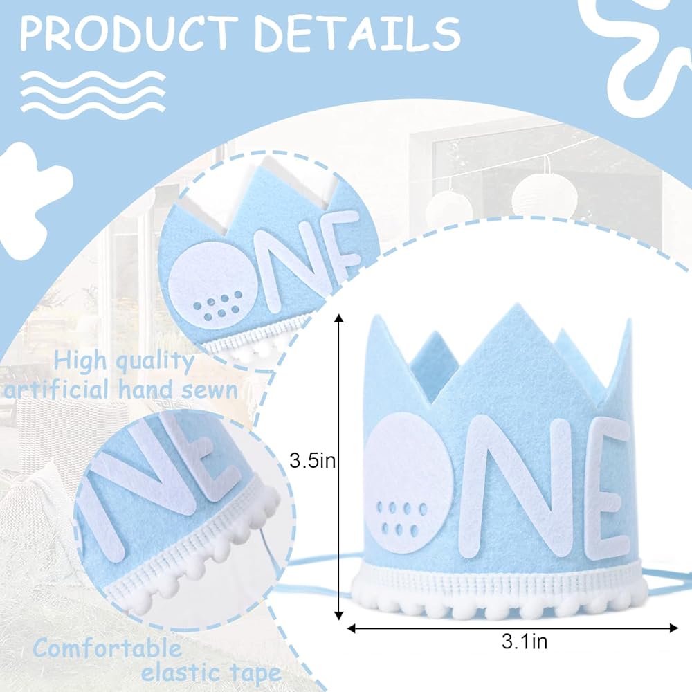 Size Fit - Our Party Hats Are Designed For Handsome Boy's 1st Birthday Party, It's The Right Size, Perfect For 1 Year Old Baby's Head Circumference, There Is A Soft Elastic Band To Hold It In Place, It's Comfortable For Baby To Wear.