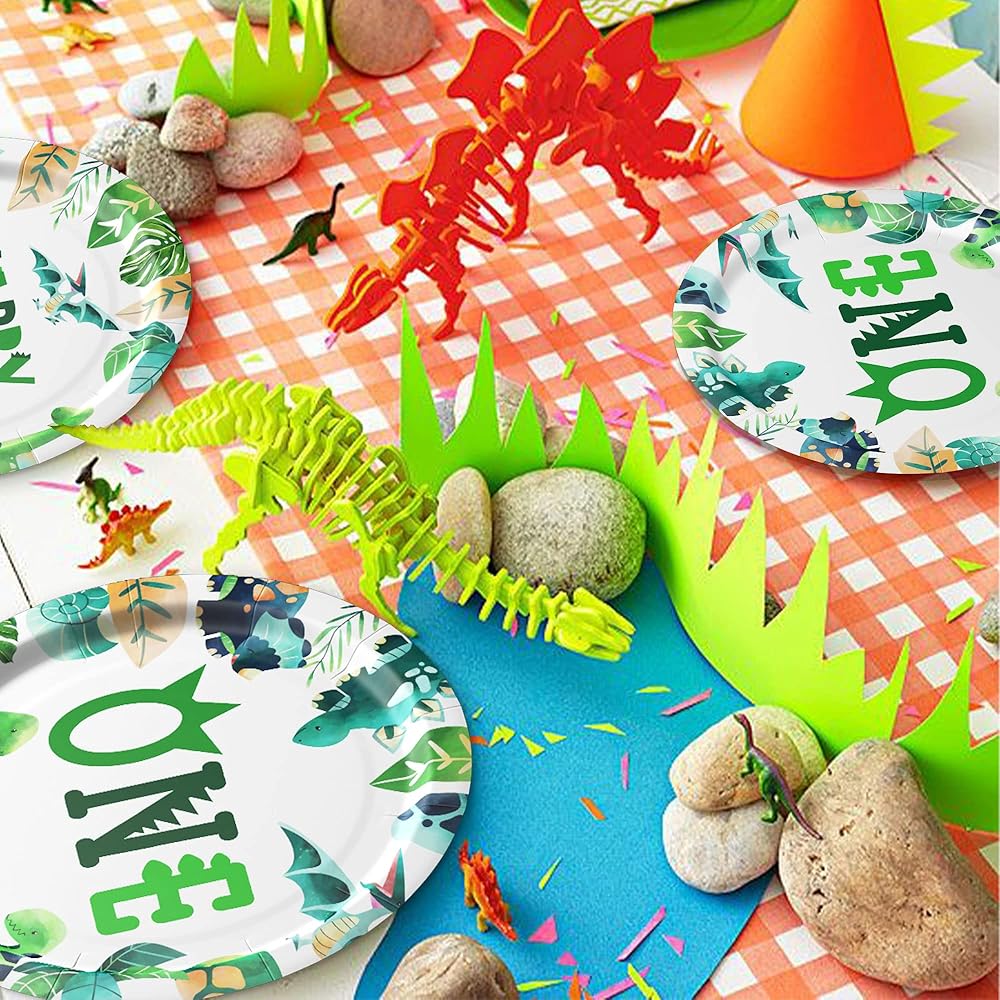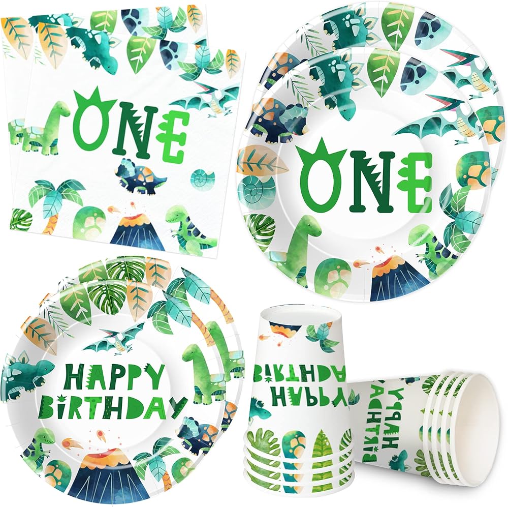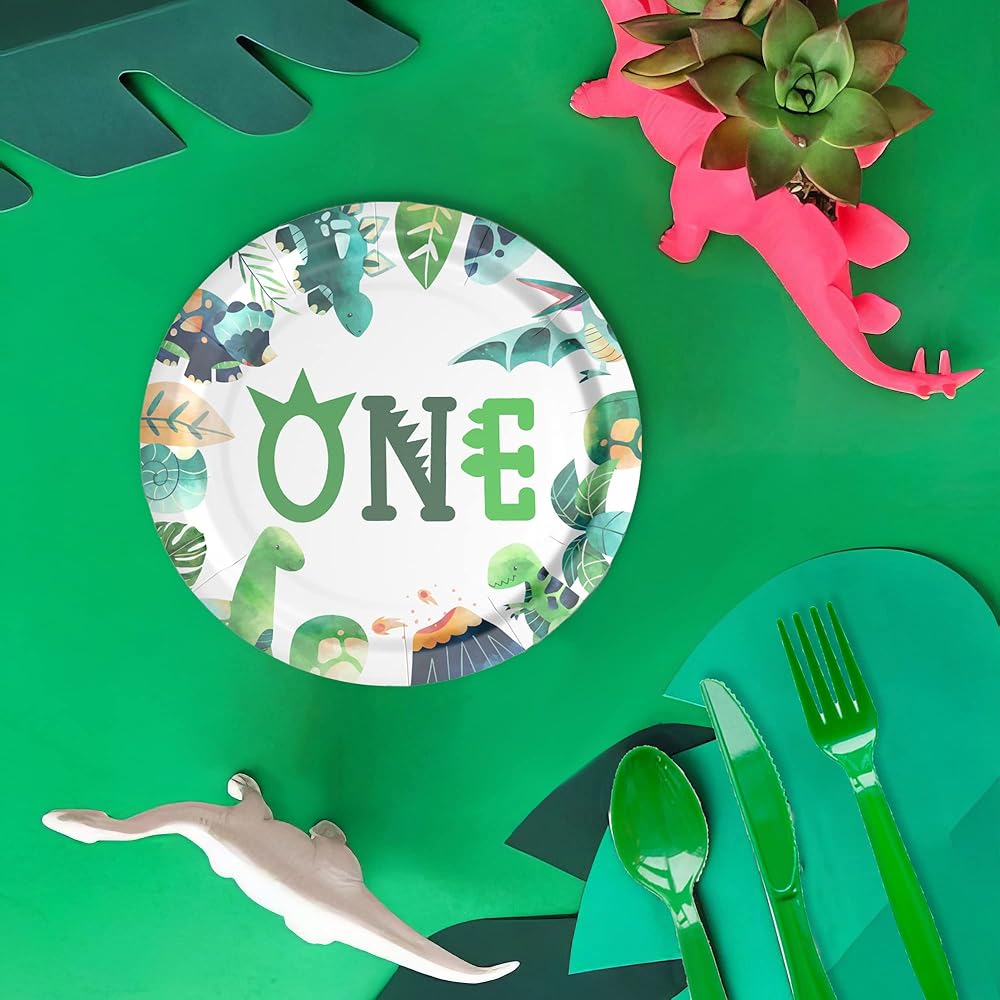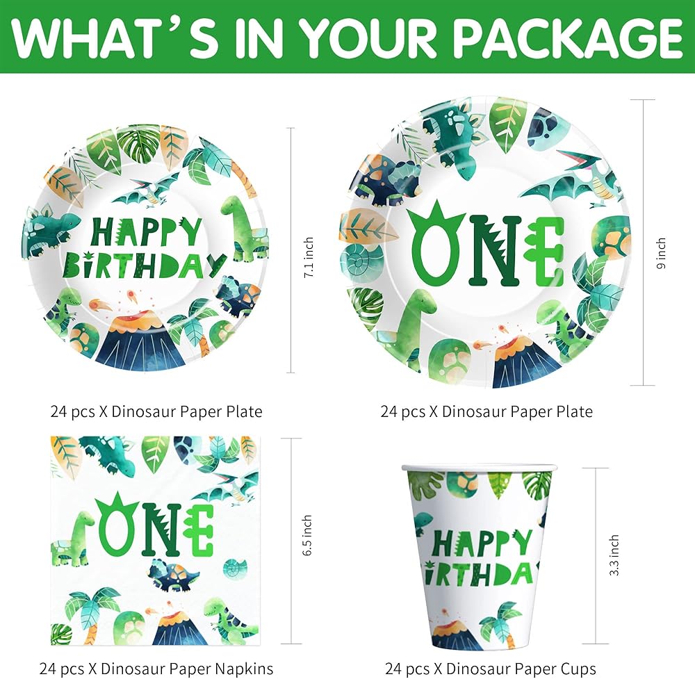 【What Will You Get】Our dino first birthday party supplies set includes everything you need for your child's special day. The set included 24pcs 9'' dinosaur 1st birthday plates, 24pcs 7'' dinosaur party plates, 24pcs paper napkins, 24pcs paper cups, for dinosaur theme 1st birthday decorations