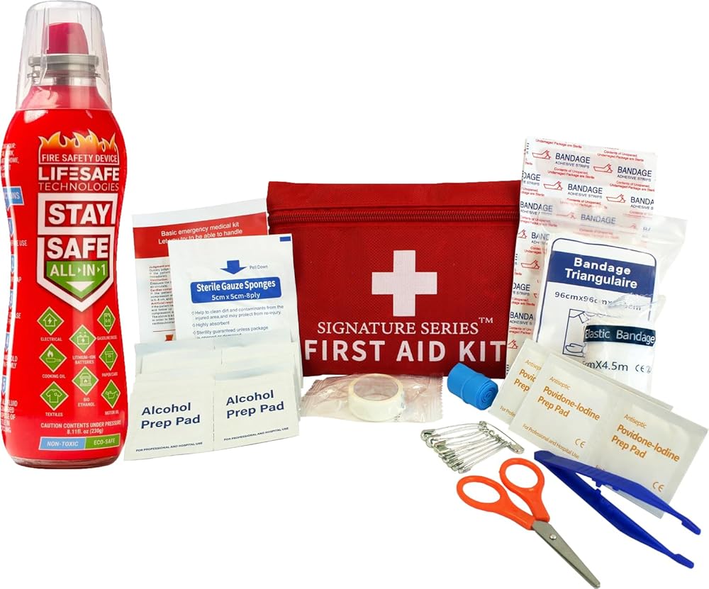تحتوي هذه الحزمة على: LifeSafe Technologies StaySafe All-in-1 طفاية حريق مع مجموعات الإسعافات الأولية من سلسلة Signature. قم بالتخزين في مواقع متعددة وكن مستعدًا عند وقوع الكارثة.