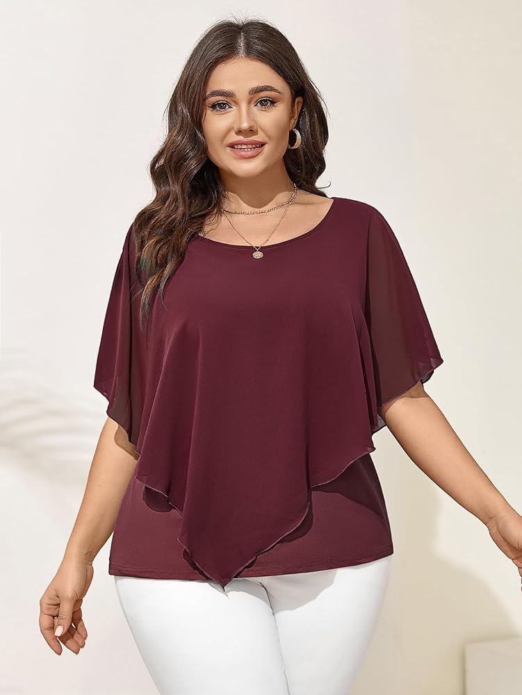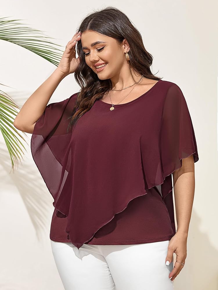 المزايا: بلوزة نسائية من الشيفون بمقاس كبير مع طبقتين، مريحة للغاية ومسامية عند الارتداء. الطبقة الخارجية المصنوعة من مادة الشيفون يمكن أن توفر لمسة رائعة. بلوزة بنمط بونشو وتصميم نصف كم، تظهر أناقتك بلطف من خلال تغطية ذراعك السميكة قليلاً. الألوان: بلوزة بيضاء بمقاس كبير/بلوزة سوداء بمقاس كبير/بلوزة رمادية زرقاء بمقاس كبير قمة
