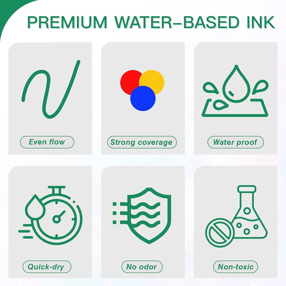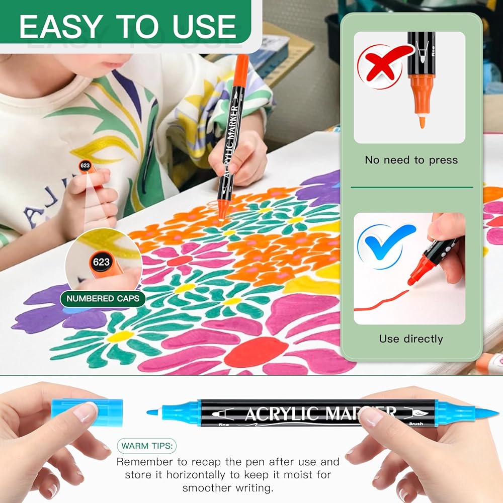 آمن وغير سام وعديم الرائحة - الحبر المائي غير سام وعديم الرائحة. يلبي كافة معايير السلامة للأطفال والكبار للاستمتاع بتجربة فنية رائعة. (يلزم إشراف الكبار على الأطفال أقل من 3 سنوات). أقلام التحديد الأكريليك لدينا جاهزة للاستخدام وتجف بشكل أسرع. حبر غير شفاف ذو أساس مائي، تغطية واسعة، مقاوم للماء والبهتان.