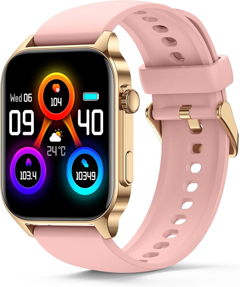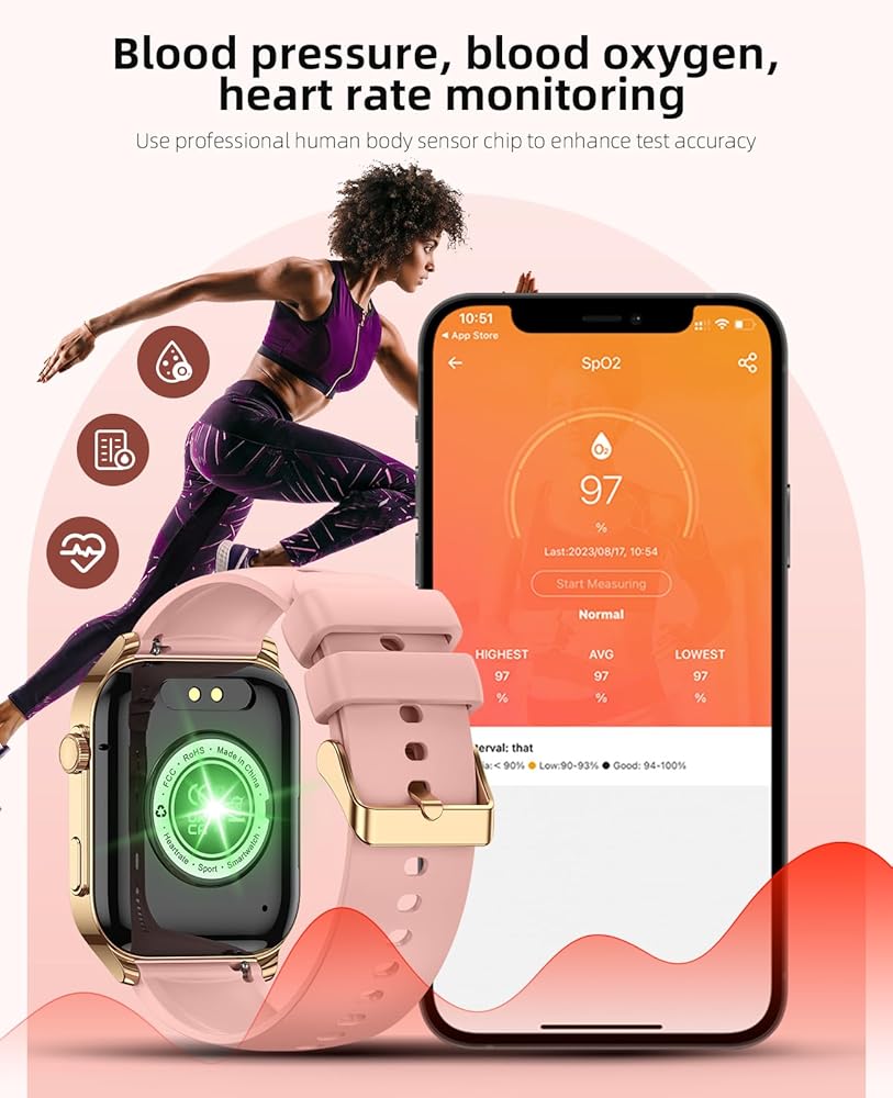 ساعة ذكية، مراقب أكسجين الدم الحقيقي بالأشعة تحت الحمراء، ساعة ذكية عالية الدقة 1.91 بوصة للنساء مع معدل ضربات القلب وضغط الدم ومراقبة النوم، ومتتبع اللياقة البدنية المقاوم للماء IP68 متوافق مع Android iOS iPhone وردي