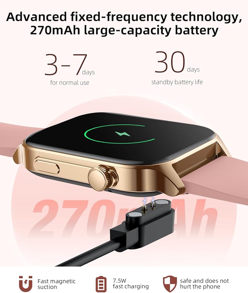 【عمر بطارية طويل وتوافق واسع】 - استمتع بحرية الاستخدام الممتد مع بطارية ساعتنا التي تدوم طويلاً بقوة 270 مللي أمبير في الساعة. ابق على اتصال ومزودًا بالطاقة، واستمتع بوظائف دون انقطاع طوال يومك. بالإضافة إلى ذلك، توفر ساعتنا توافقًا واسعًا مع أجهزة Android 5.0+ وiOS 9.0+، مما يضمن التكامل السلس مع النظام البيئي لهاتفك الذكي. استمتع براحة الساعة التي تواكب نمط حياتك النشط وتظل متزامنة مع جميع أجهزتك.