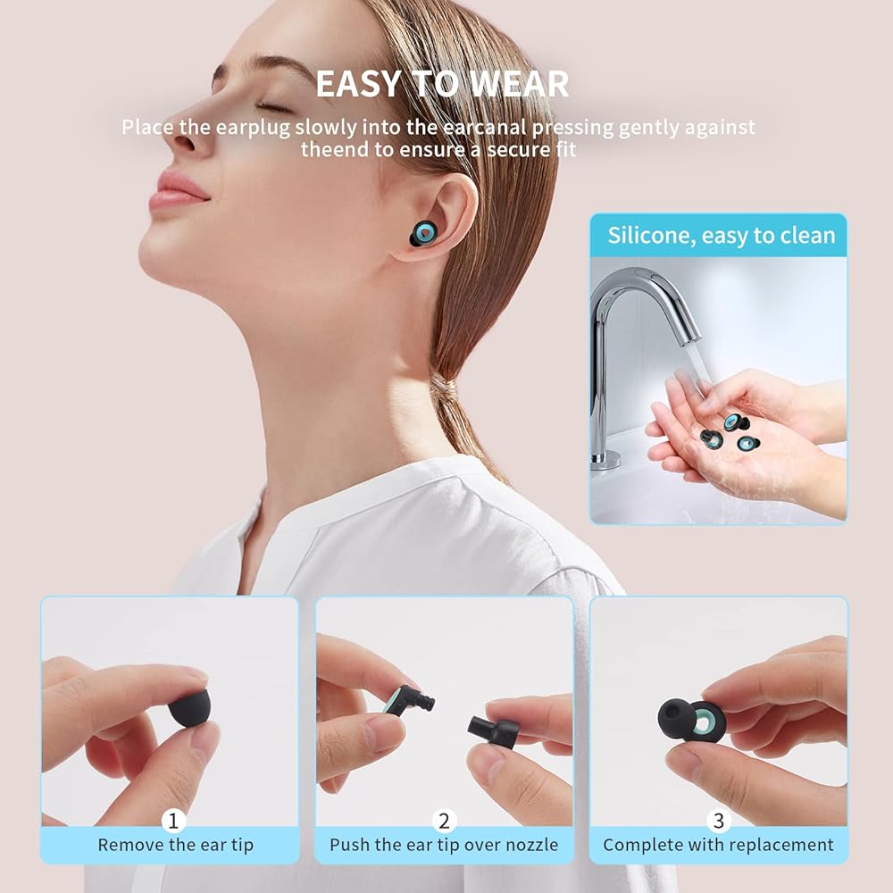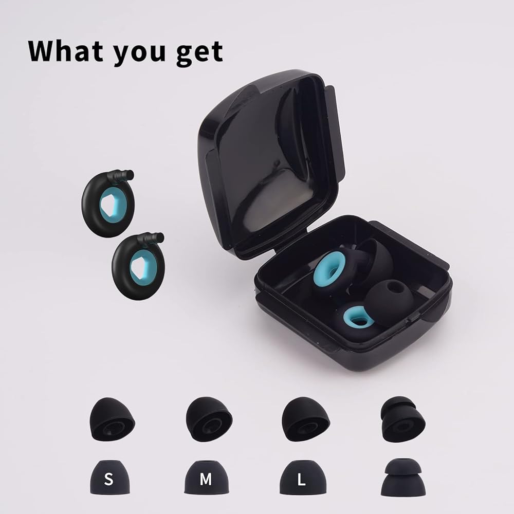 The package of earplugs for sleep contains, 1 set of hearing protection earplugs, 3 sizes of soft silicone ear tips (s-m-l), 2 pairs of silicone earplugs and a mini black storage box. The storage box is light and easy to carry, put the extra replaceable earplugs in a sealed bag for storage, test them before use to find the right size for you to achieve the best noise blocking and comfort level