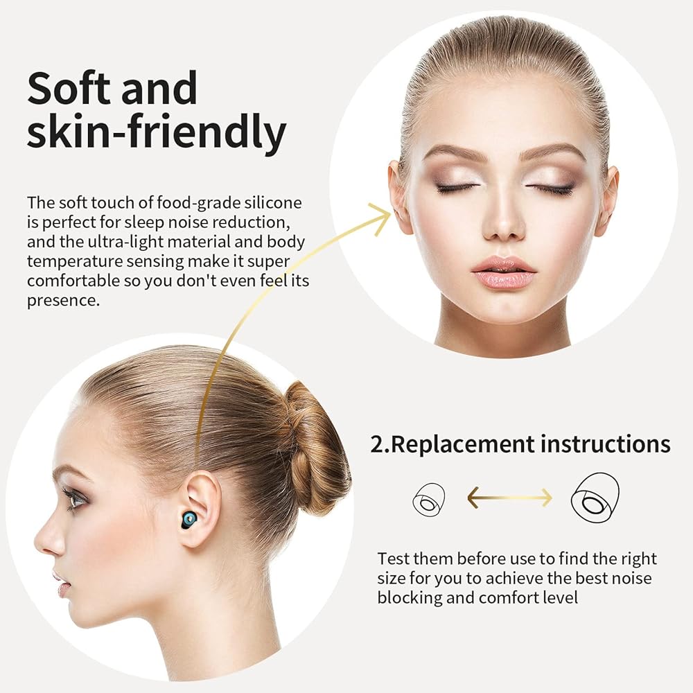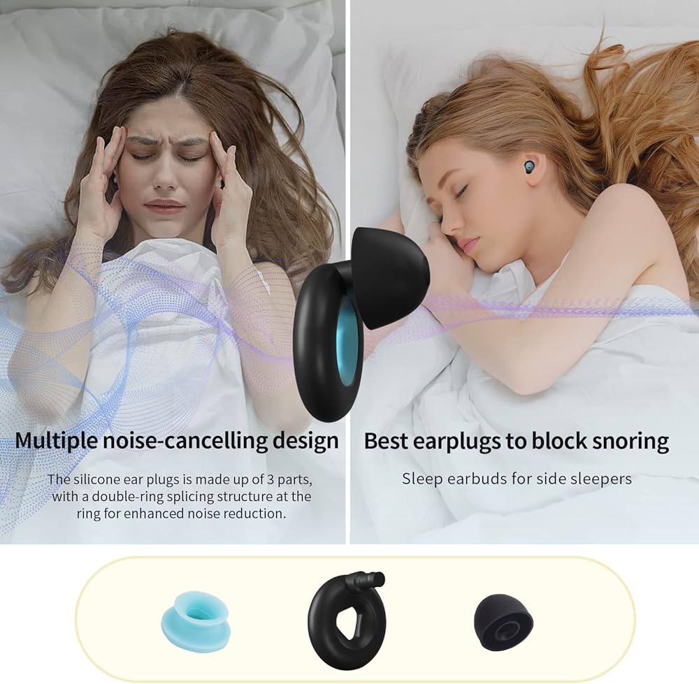 Ear plugs for sleeping noise cancelling designed for side sleepers with a curved ring design to keep them comfortable while sleeping on their side. The soft touch of food-grade silicone is perfect for sleep noise reduction, and the ultra-light material and body temperature sensing make it super comfortable so you don't even feel its presence.