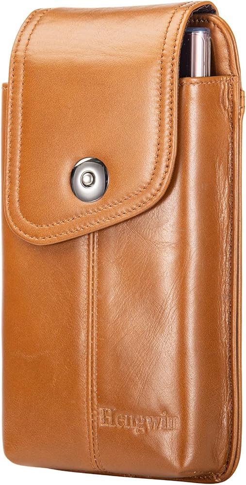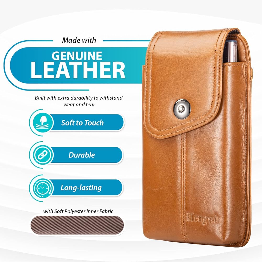 حافظة هاتف من الجلد الطبيعي من Hengwin تناسب هاتف iPhone 15 Pro Max 15 Plus 14 Pro Max 14 Plus Samsung Galaxy S24 Ultra Holster مع مشبك حزام وحلقة حزام وحامل بطاقات للهاتف الخلوي (بني)
